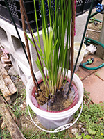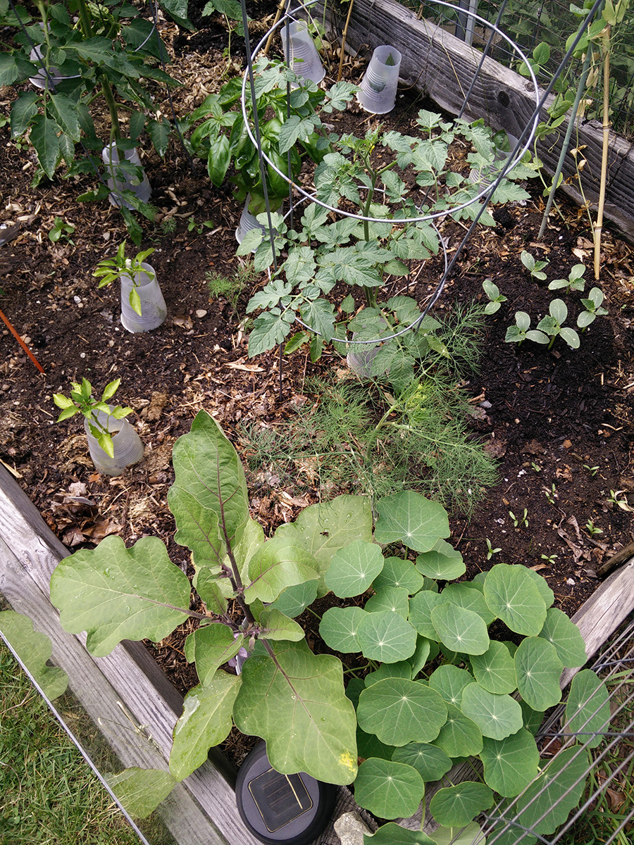just 3 days had passed since my last backyard garden inspection. rabbits still seem to be in the garden despite collaring most of the plants. they did kill an uncollared sweet potato plant, which made me go around and put additional plastic collars on all the other sweet potatoes. also, despite putting up a better cage around the cucumber seedlings, it kept away hungry rabbits, but it didn't stop insects from consuming half of the seedlings. i will need to replant for the 3rd time.