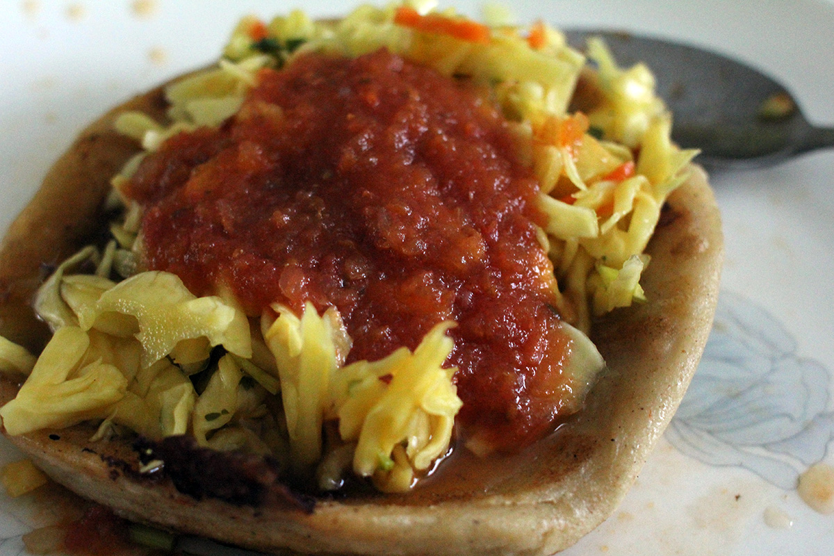 coming home underneath the mcgrath highway, i saw that the el salvador restaurant was opened. i made a quick decision, pulled a u-turn, and stopped inside to get some food. the place was empty except for 2 workers sitting by a table eating lunch and watching a telenovela on a wall-mounted HDTV. i ordered 3 pupusas at $2 a piece and waited for them to make it to go.