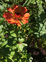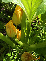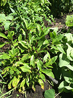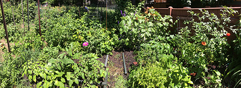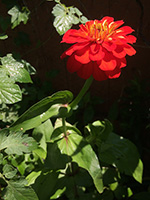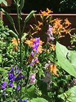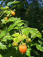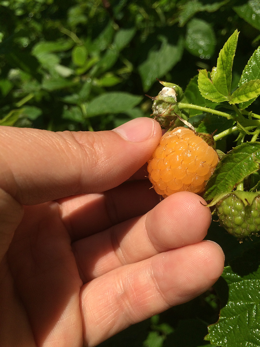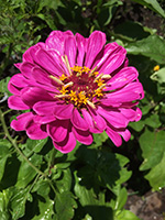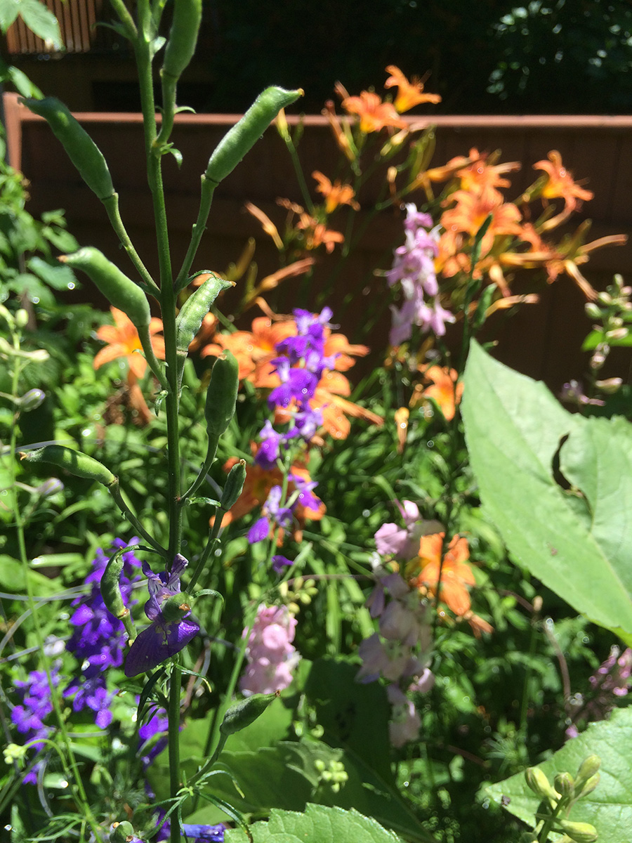 i stopped by the community garden on my way to market basket. more spots of color as the zinnias have bloomed. for now just a single flower per plant, but more blossoms over time. that one dry zinnia flower i saw 5 days ago? just haven't fully bloomed yet. i noticed the delphiniums have formed seedpods; i was tempted to snip them off, but decided to keep them, figuring they might self-sow and i could get more delphiniums next year. besides, it seems like new flower buds were forming underneath the seed pods, so it'd be hard to snip off without snipping those as well. there were also many ripe golden raspberries, i'll have to come by with a container and pick them before they fall off.