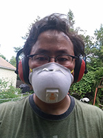 in the early afternoon i went to my parents' house to begin sanding the outside shingles. i was the one who originally did the research for orbital sanders, but never got a chance to really use it, other than to do some test sanding when we first got it back in the summer of 2012. it's quite the spectacle, running a long extension cord halfway around the house, and making a lot of noise when the sander is operated in tandem with the shopvac. the western side of the house gets a lot of sun in the afternoon and gets pretty hot. i was sweating something fierce inside my dust mask. i had on a pair of earmuffs to drown out the noise.