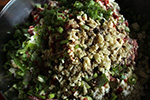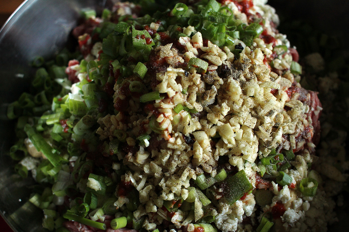 finally i rode to belmont, where because of the holiday long weekend, i decided not to do any noisy sanding work. i mixed up the ground beef (80% lean, i like it fatty, adds more flavor) along with the other ingredients: blue cheese, worcestershire sauce, huy fong sriracha (normally frank's red hot sauce but the bottle was expired and tasted a wee bit funny), scallions, garlic (both ingredients my mother helped me chop), grey poupon mustard, and black pepper powder (normally gresh ground pepper but my parents didn't have any peppercorns).