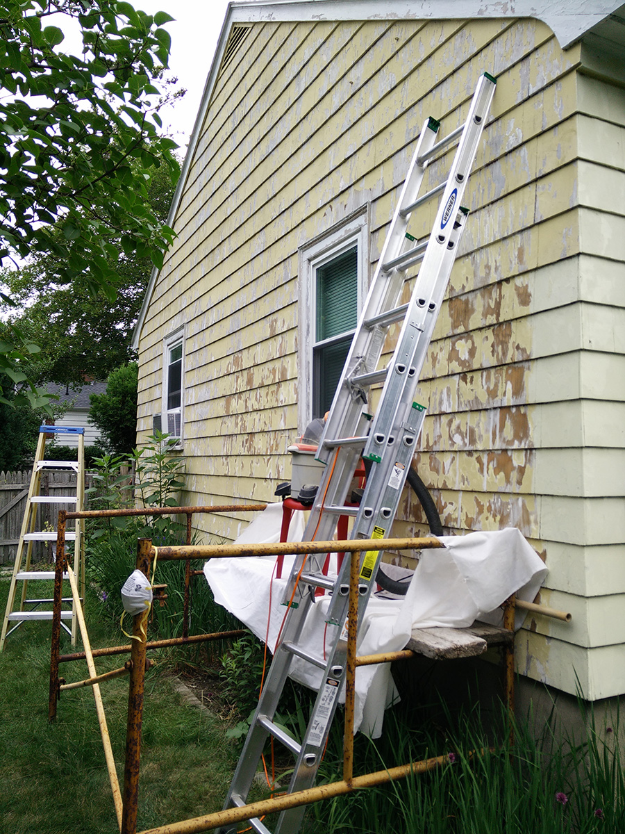 i woke up at 8:00 and biked to belmont by around 9:00. i took my trek allant, figured the bigger wheels could get me to my destination faster. i was surprised to see my father at home, sanding the western wall. he relocated to caulking duty while i climbed the ladder to sand some higher shingles. he left for the cafe by around 10:00, while i continued working until 1:00. it wasn't very hot today, with temperature in the 70's, downright pleasant. there was even a nice overcast (i knew it wouldn't rain, the forecast said not until late evening). by noontime the sun began to peek out again and it got a little sunny but not unpleasantly so. i could've worked a bit longer, but my arms were tired so i figured it'd be a nice time to stop (1:00). while hauling the shopvac into the garage, i saw my mother biking home.