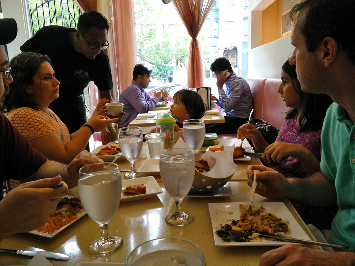 the supposed rainstorm wouldn't happen until later in the afternoon, so i could've sanded if i wanted to. but instead of working on the house, i biked into boston to meet up with dan and company for lunch. indian food was the collective choice. normally there's an indian buffet place on mass ave i've been to a few times with these guys, but unfortunately it closed. the new venue was mela in the south end. i told them to give me a 30 minute head start (i'd be coming via bicycle), they told me at 11:30 to meet up at 12:15.