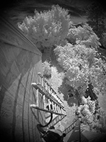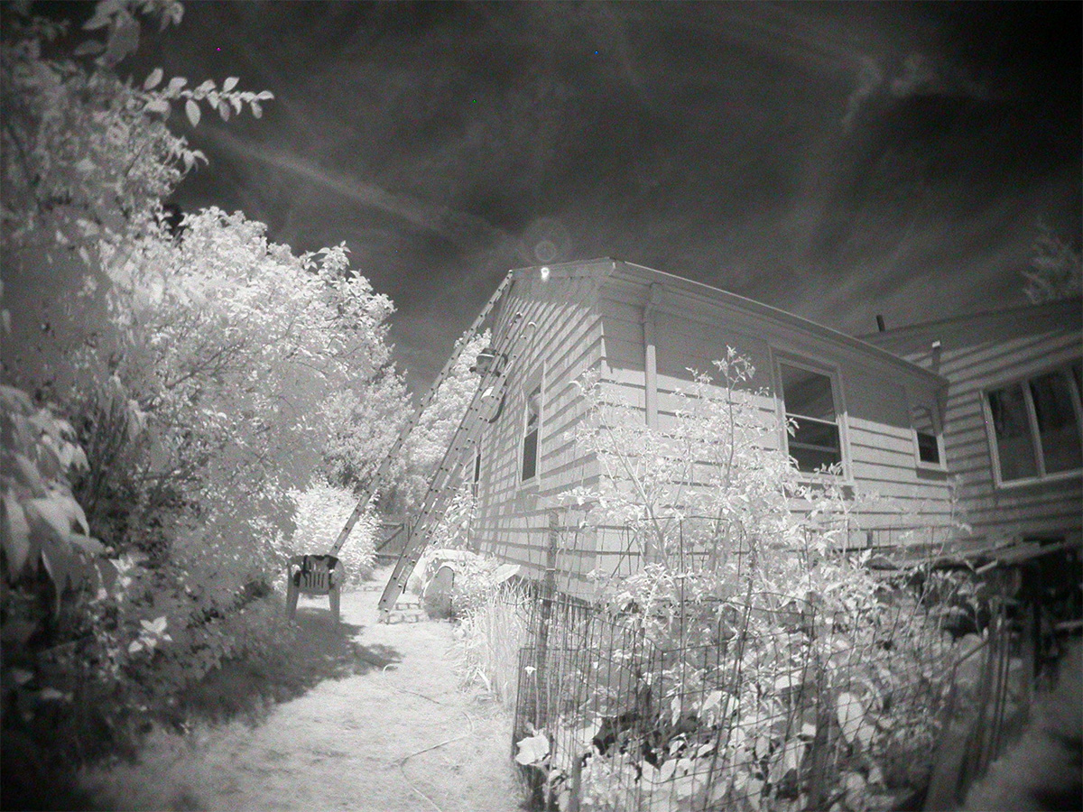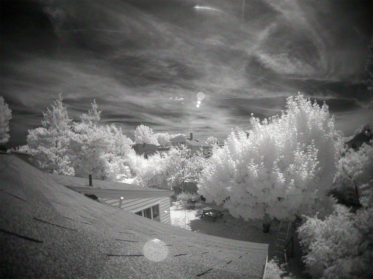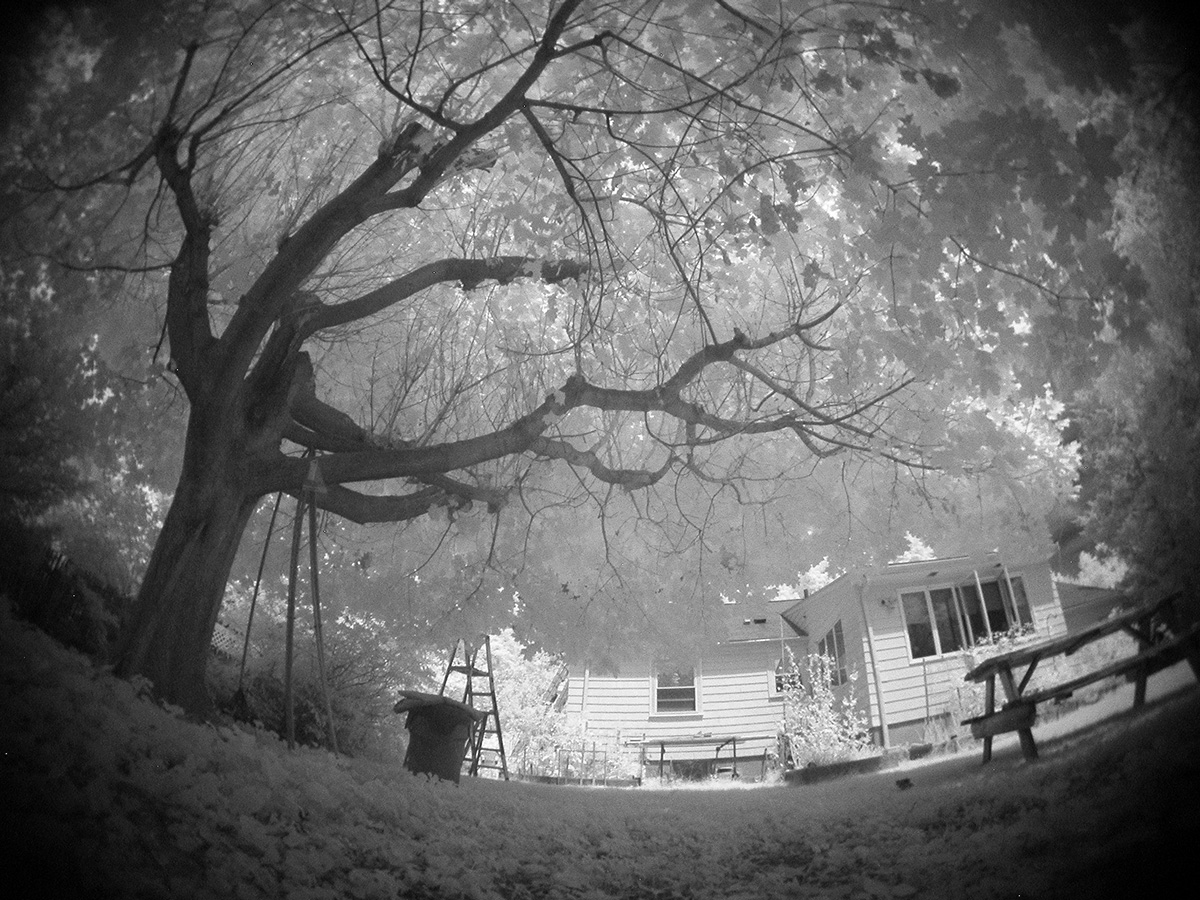 the idea came to me yesterday while up on the ladder, looking at the blue sky, white clouds, and numerous trees: wouldn't it be great if i could take some infrared photos? so this morning i brought my old nikon coolpix 4500, the one camera that i have that can effectively take infrared photos. not just infrared, but infrared wide angle fisheye photos. all this thanks to a 28mm filter that i can slip inbetween the camera and the fisheye lens.