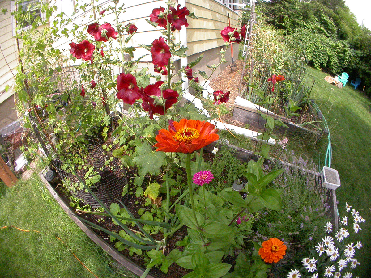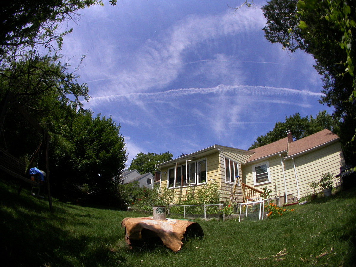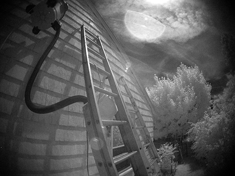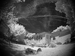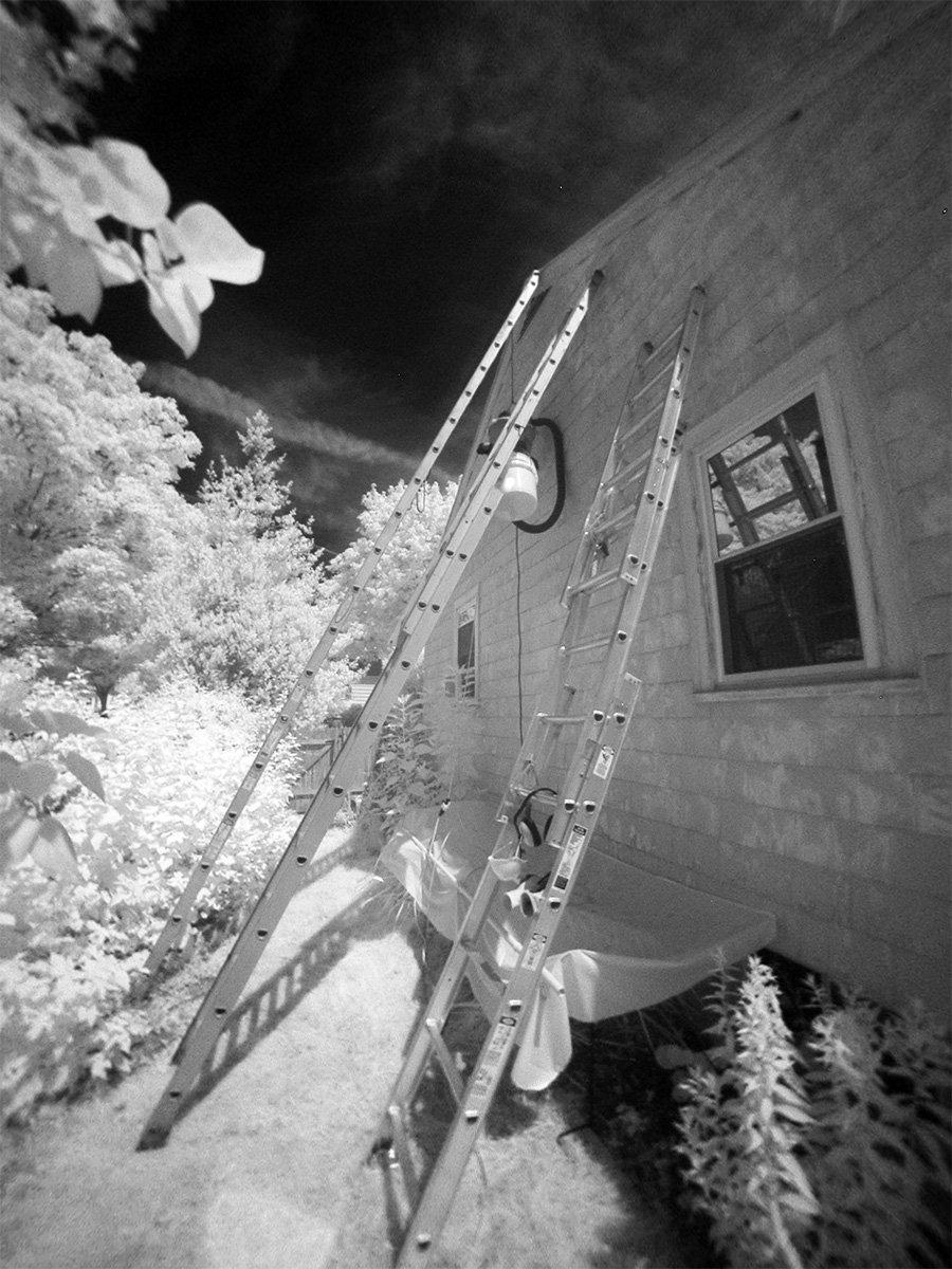 the idea came to me yesterday while up on the ladder, looking at the blue sky, white clouds, and numerous trees: wouldn't it be great if i could take some infrared photos? so this morning i brought my old nikon coolpix 4500, the one camera that i have that can effectively take infrared photos. not just infrared, but infrared wide angle fisheye photos. all this thanks to a 28mm filter that i can slip inbetween the camera and the fisheye lens.
