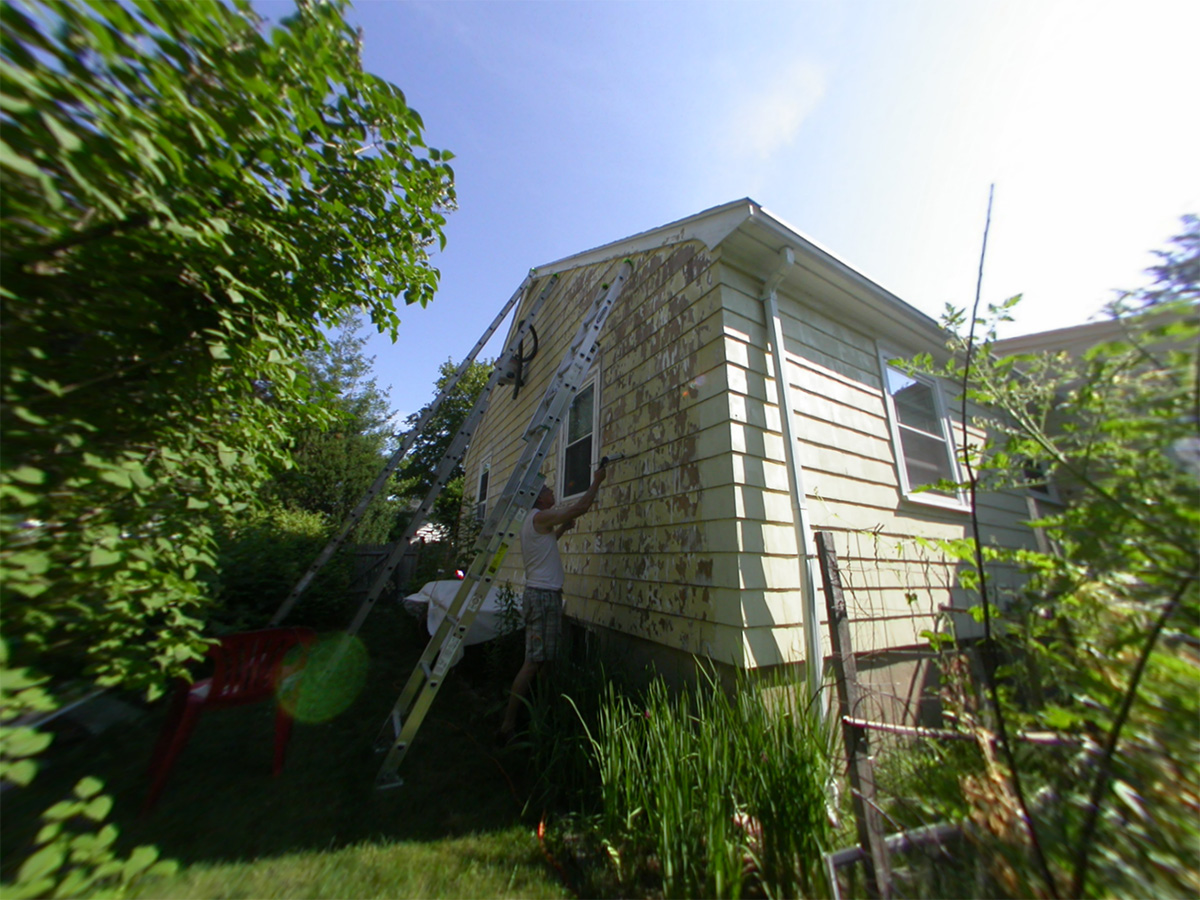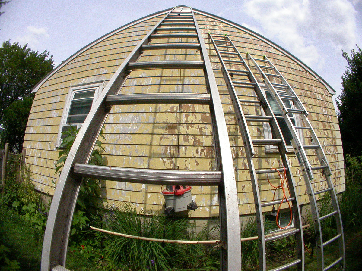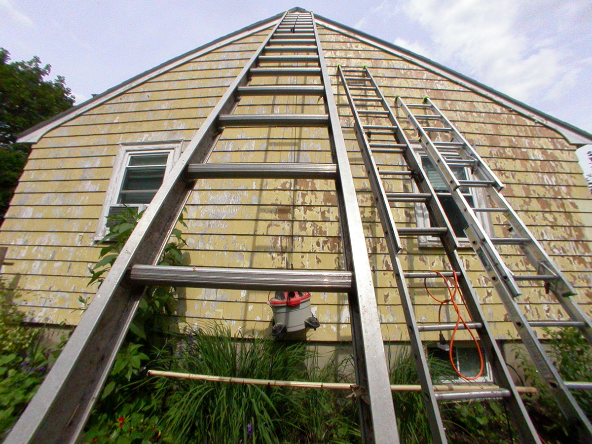 my father was already outside caulking between the shingles when i arrived at 9:00. i was ready to sand but spent that first hour scraping off loose paint. early my father had already set up a tarp underneath, held in place using push pins, staples, some small metal shepherd's pole, and a long bamboo stalk. only after he left for work around 10:00 did i finally begin to sand.