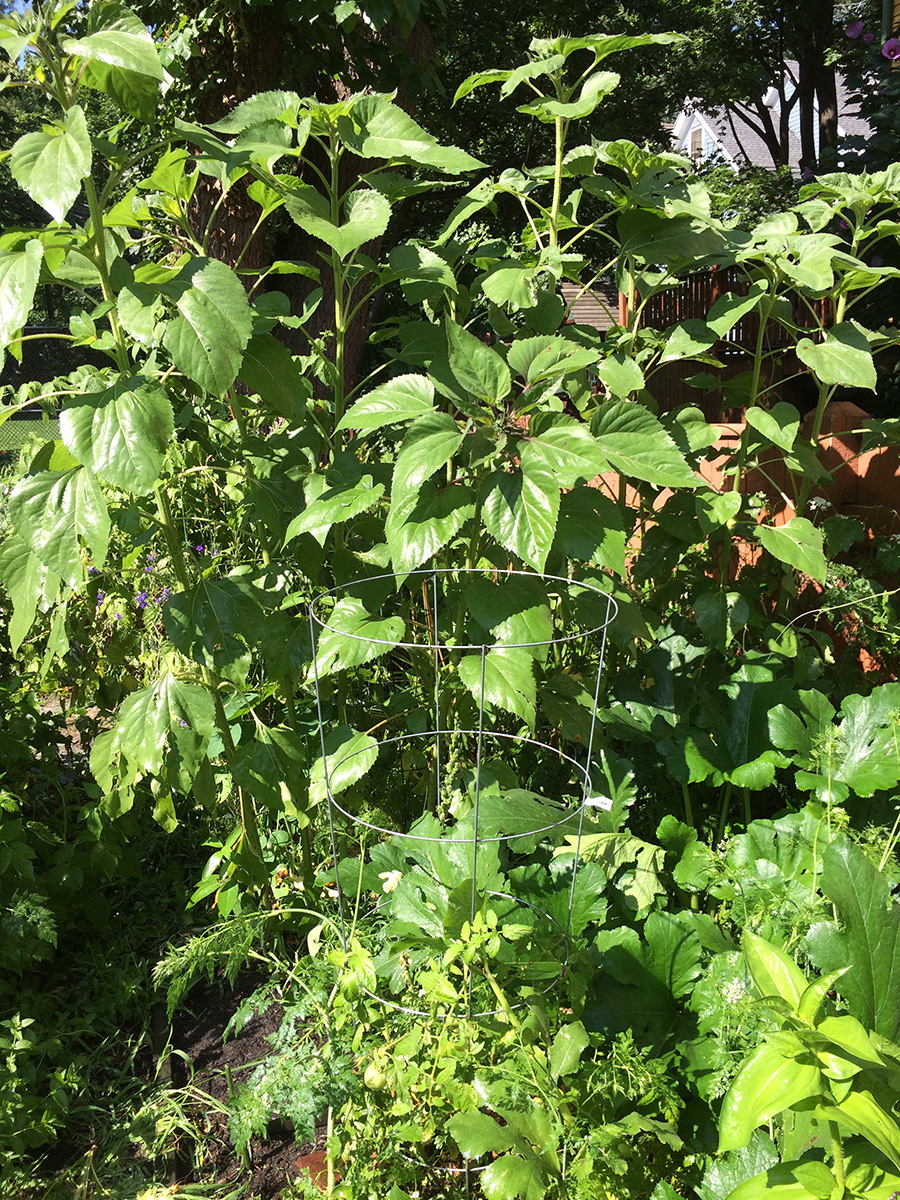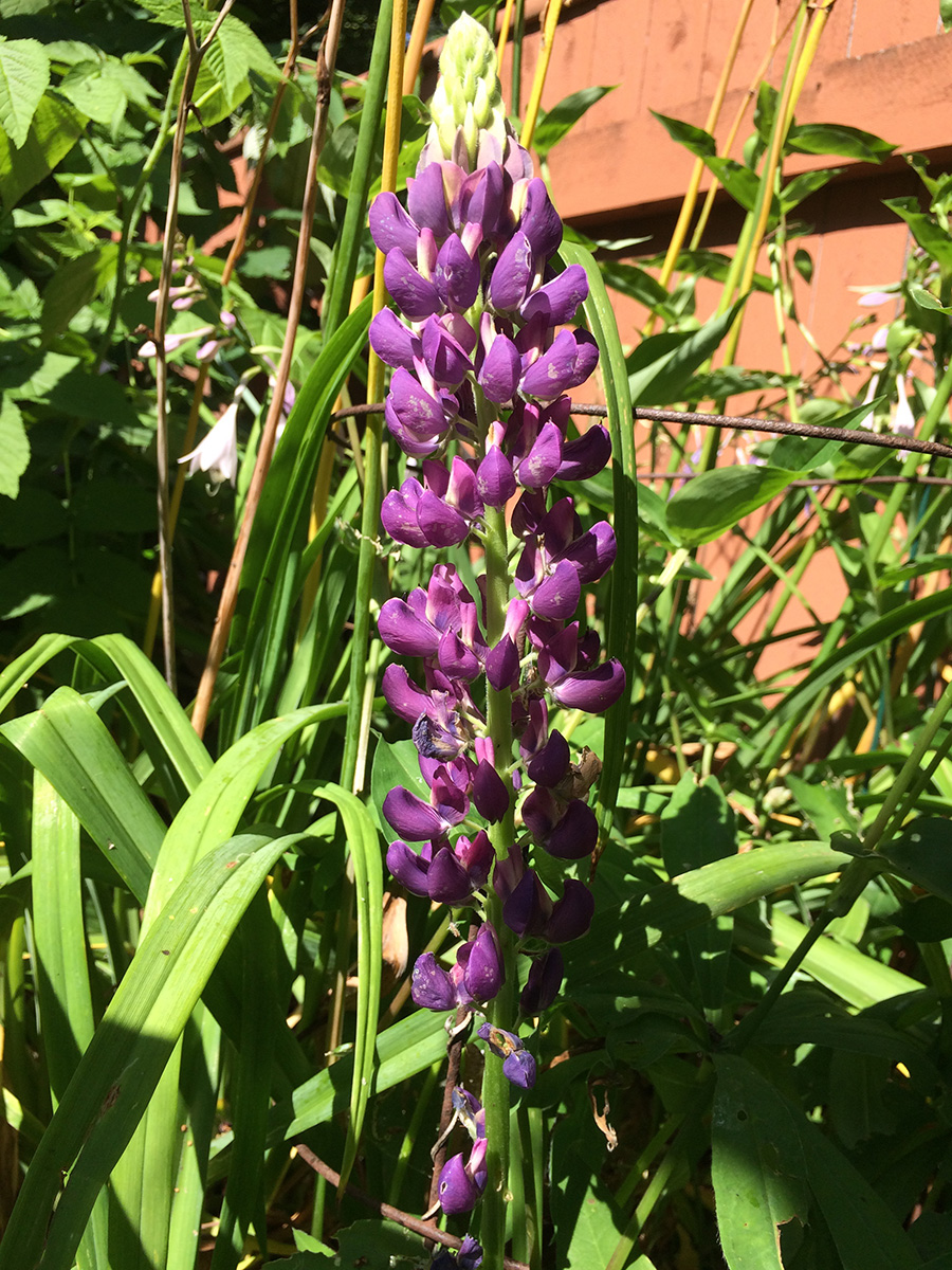 back in cambridge, after changing into a pair of shorts, i bicycled to the community garden. with all the sanding work i've been doing, i haven't had time to visit my CGP and it's been 11 days since my last visit. my plot was like a jungle, a mixed sea of greens punctuated by large round discs of colors, unusually large seed-grown zinnias. i almost missed it, but behind the wall of sunflower stalks, there was a lupine flower! i'm surprised it flowered earlier than the lupine in belmont, since this particular plant doesn't get as much sun.