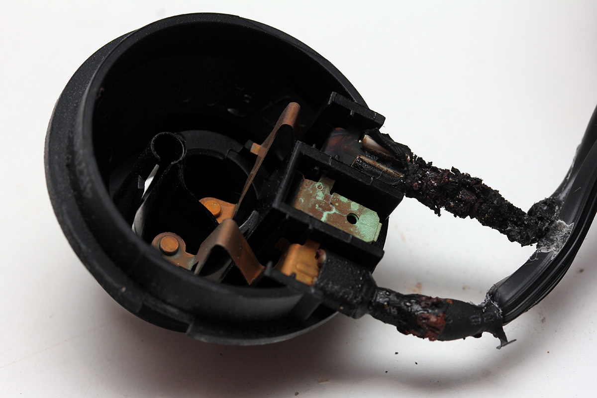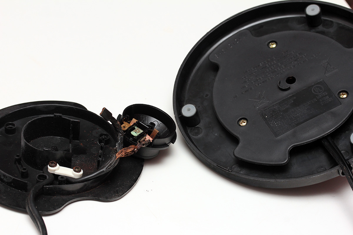 later in the evening i went to go investigate my electric kettle. i bought it used back in august 2010 and it's been very reliable up until now. taking apart the base was just a simple matter of unscrewing 3 screws. what i found inside was horrifying: the wires were frayed and melted, super dangerous, definite fire hazard. i'm glad i noticed the problem before using the kettle again, because it could've burned the house down.