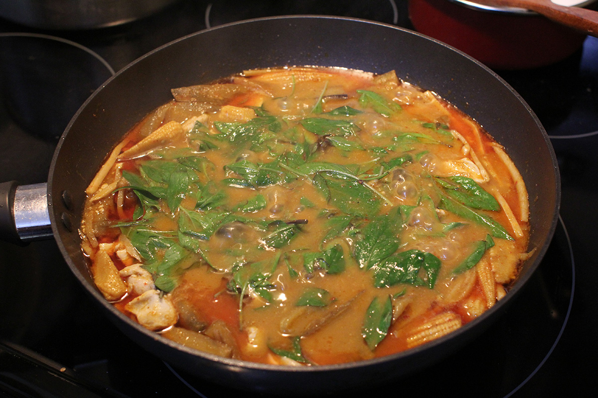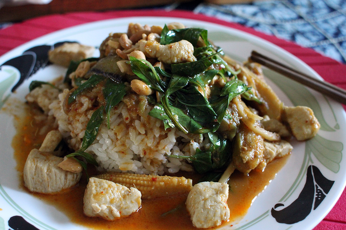 * prik khing curry using garden eggplants and thai basil: other ingredients - chicken breast, baby corn, bamboo shoots, cashew nuts. father stir-fried the cubed chicken first, followed by a steam simmer of the sliced eggplants. then the curry paste and coconut milk was allowed to simmer with baby corn and bamboo shoots, adding the eggplants and slow cooking for 20+ minute until they're nearly melted before adding the chicken and basil.