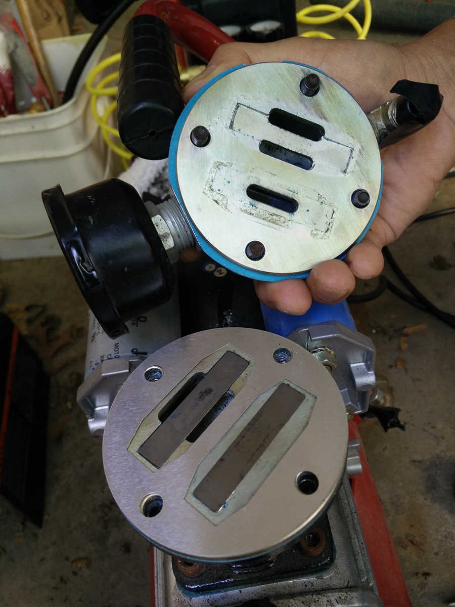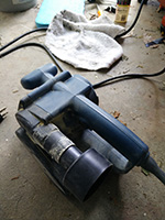 i stopped sanding by noontime, the exposed sun making it too hot to work. still, it took me about half an hour to clean up, the hardest part scooping up the dust left on the tarps. since i'm doing detail sanding now, i don't bother with the shop vac anymore. at one point i even brought out the belt sander, on a particular patch of thick paint that needed something more heavy duty than a gentle orbital sander. speaking of which, i switched to the old RO sander, the one who brought back to life with some replacement parts. the new sander needs a break skirt replacement, i can feel it eating more wood than i'd like.