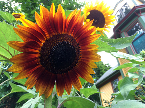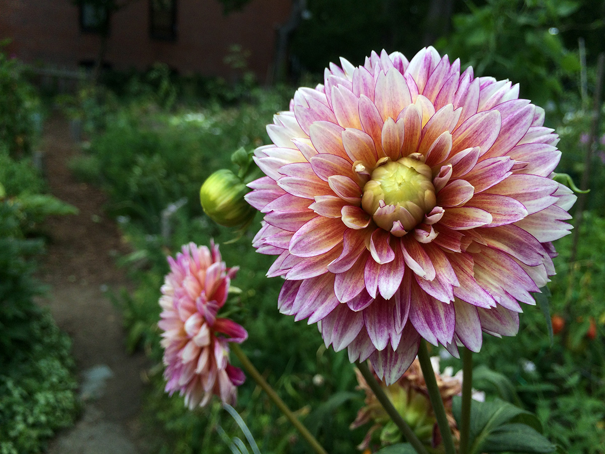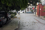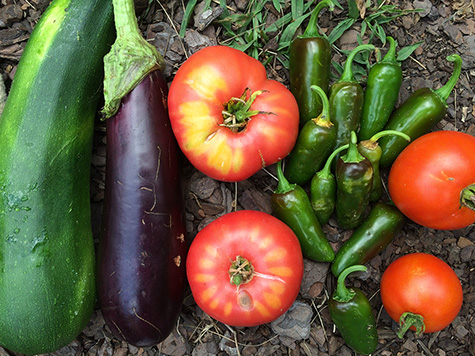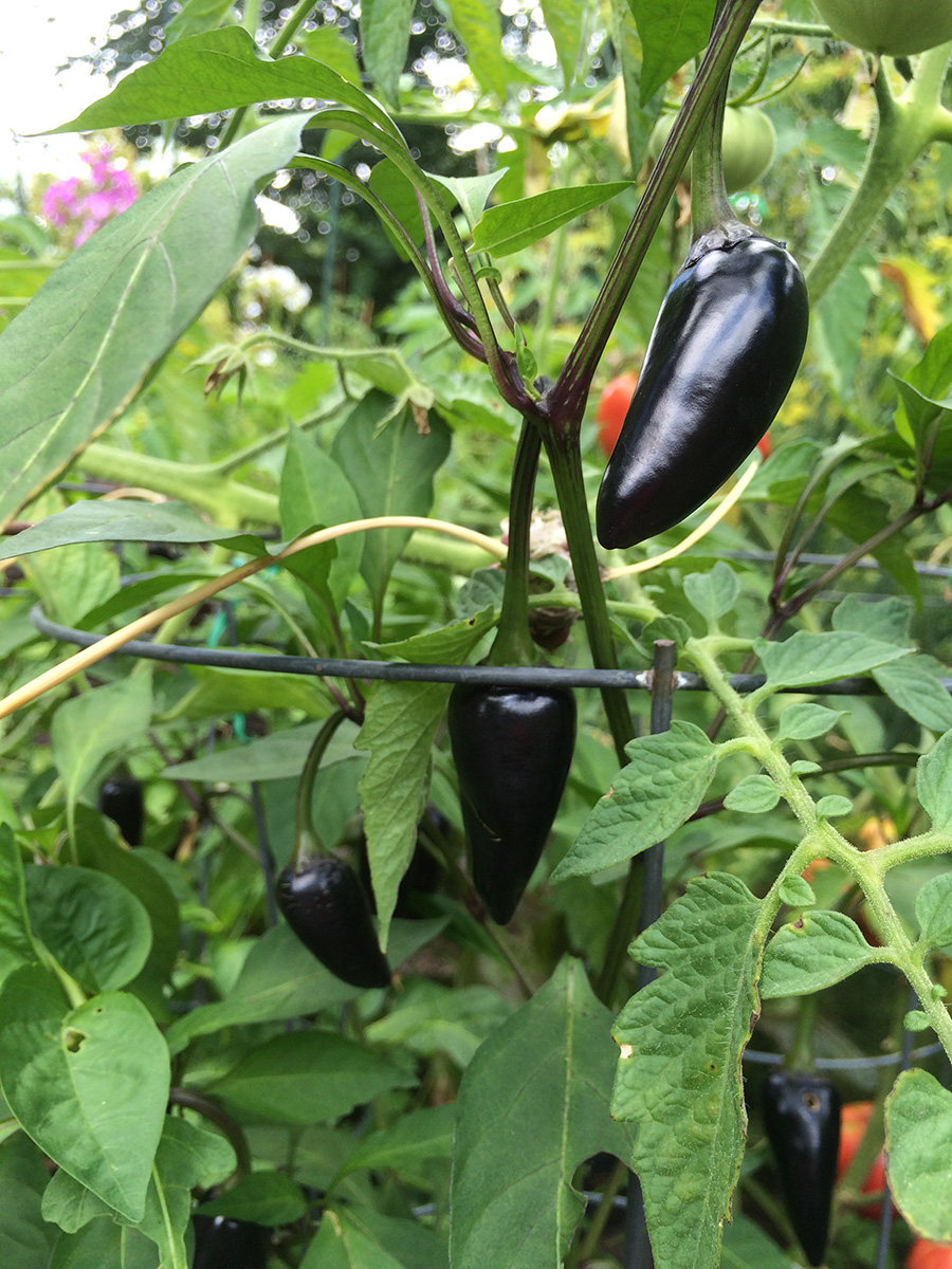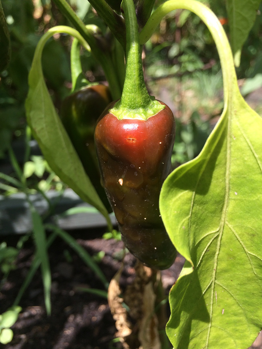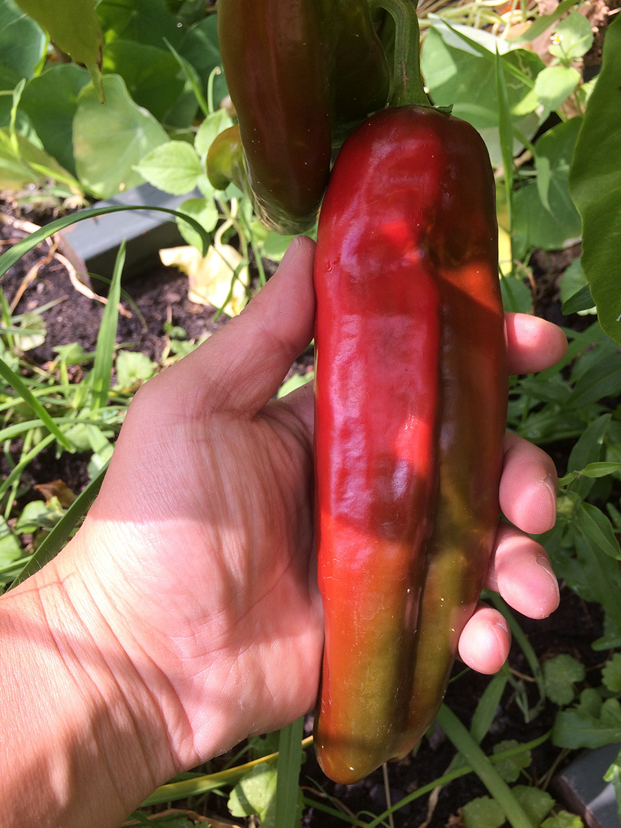 i went for a grocery run after i got home (while getting my bicycle from the backyard, i found three large boxes waiting for me, frances' merchandise), first making a detour at the community garden. it rained a little bit early this morning so the soil was still damp. i didn't bother watering, but instead collected some ripe vegetables: 4 tomatoes, a bunch of old jalapeno peppers, an eggplant, and another zucchini.