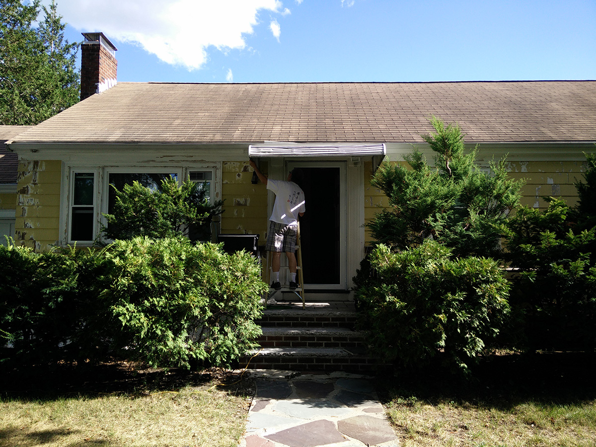 i went to sleep around 4:30am last night. i took my mother's advice and decided i didn't have to wake up so early, since i'm only sanding the north side of the house, which is in the shade. after several snoozes, i finally got up around 9:00am, and arrived in belmont by 9:30am. today i sanded the two upper sides by the living room window, then went back with both belt and orbital sander to clean up any rough areas. a neighbor a few houses down (the one with the solar panels) is also doing some house painting; they hired a professional team, which scraped yesterday, and had the façade all finished and painted today.