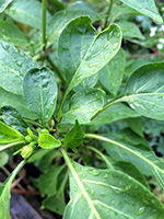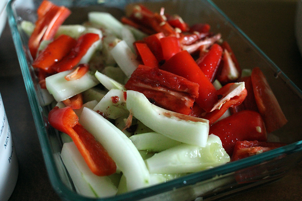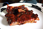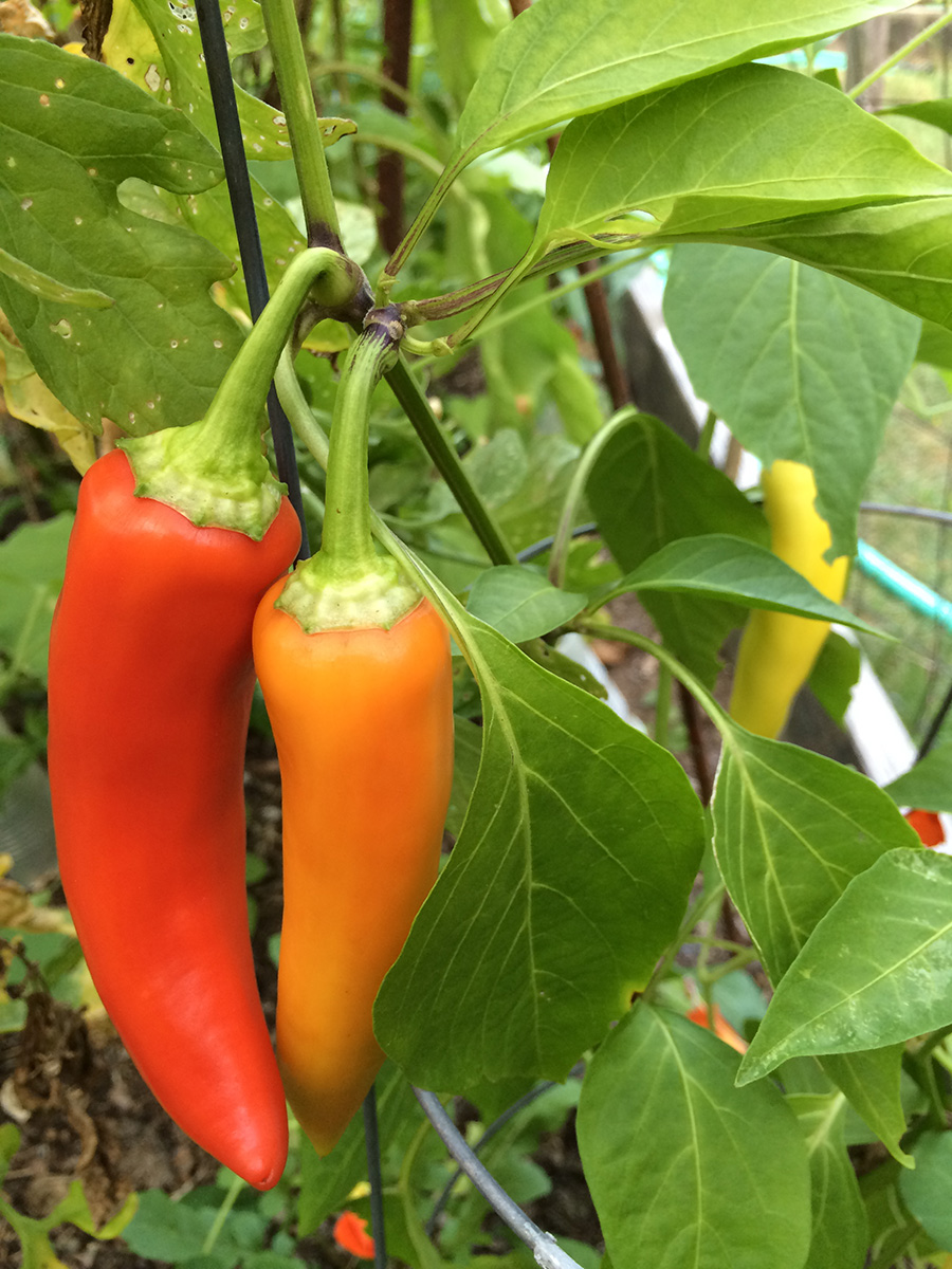 for dinner my mother and i cooked a slab of ribs in the oven. i had 5 slices before i was full. she also made a cucumber hot pepper salad. my mother never believes in the potency of any of our backyard-grown hot peppers. so when she sliced into some red anaheim peppers from RB1 (not to be confused the hungarian wax from RB4), so was surprised that the cut on her finger started to hurt. later when she tried to eat one of the peppers, she kept crying that it was too hot and picked them all out of the salad. the weird thing is anaheim peppers are supposed to be mild. in fact, there was no pungent odor alerting you to the fact that this was a very hot pepper. maybe i disidentified them and they're not anaheims after all, but rather hungarian wax peppers. they both look the same, except these anaheims were growing downwards, while the hungarians grow upside down but later grow rightside up again.