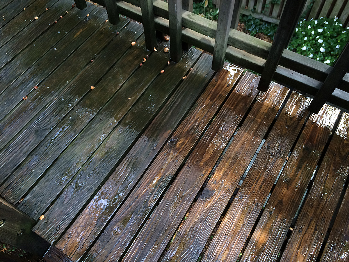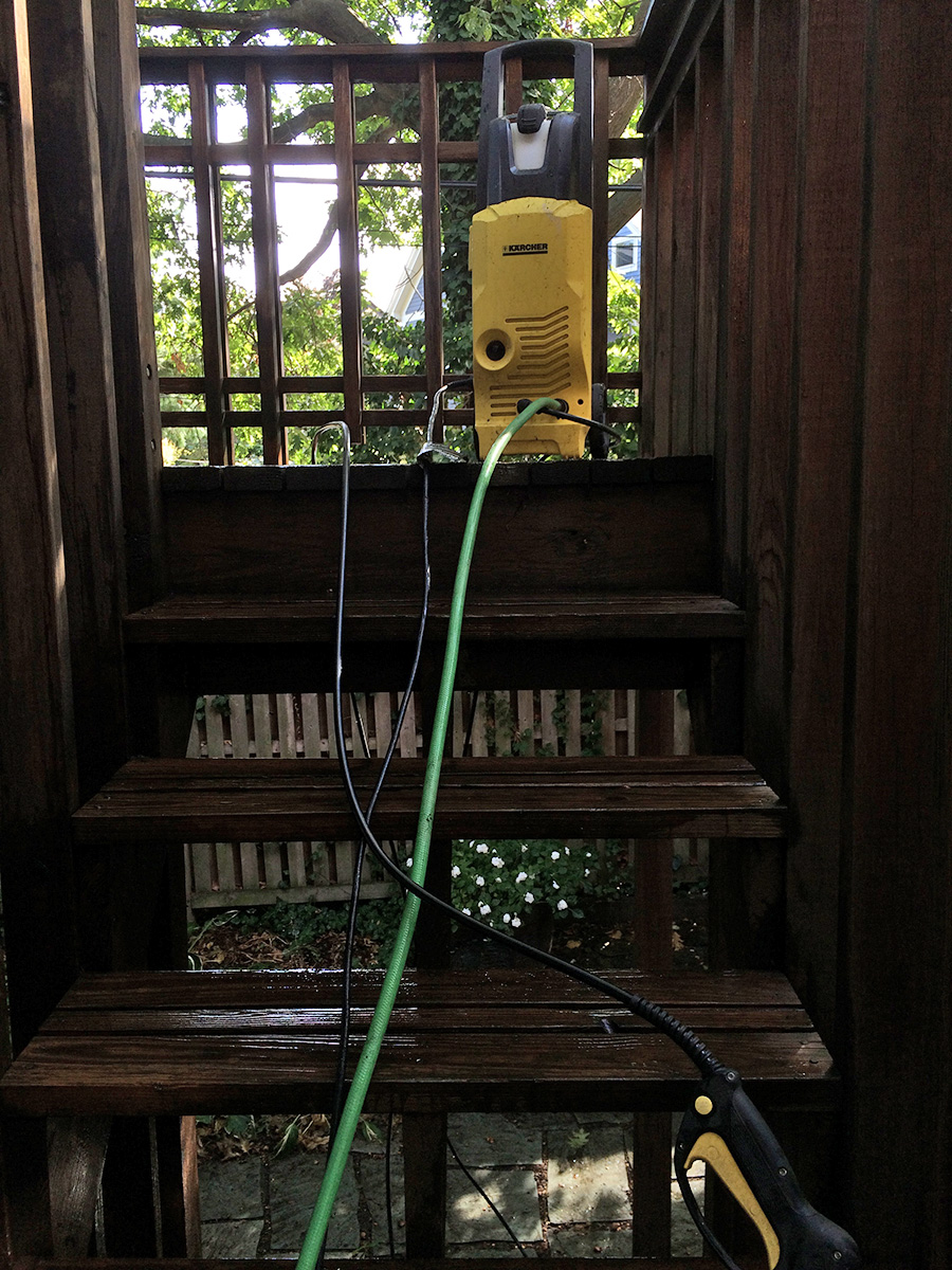 since i was on a roll, i decided to wash the flagstones in the backyard. for that i used the jet nozzle, which is a much stronger stream. i one point i was picking something up and accidentally sprayed my fingers with the jet nozzle for a split second, which hurt. i switched back to the spray nozzle and washed a section of the wooden fence. the really amazing thing was it was able to wash off the algae but not harm the ivy growing on the boards.