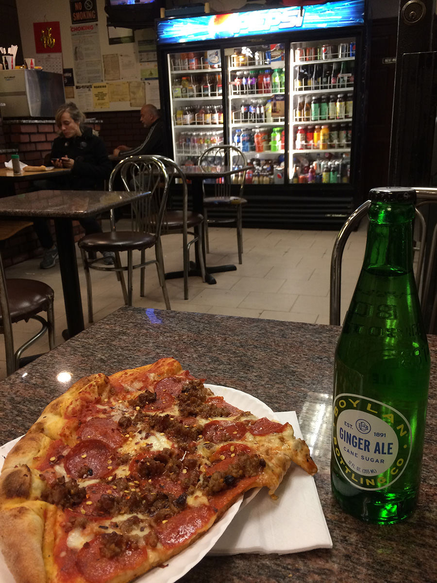 when deanna finally came home, i took the opportunity to go out briefly to get something to eat. that something was giardini the corner pizza shop. 2 slices of pepperoni/sausage brooklyn-style pizza with a soft drink was $10!