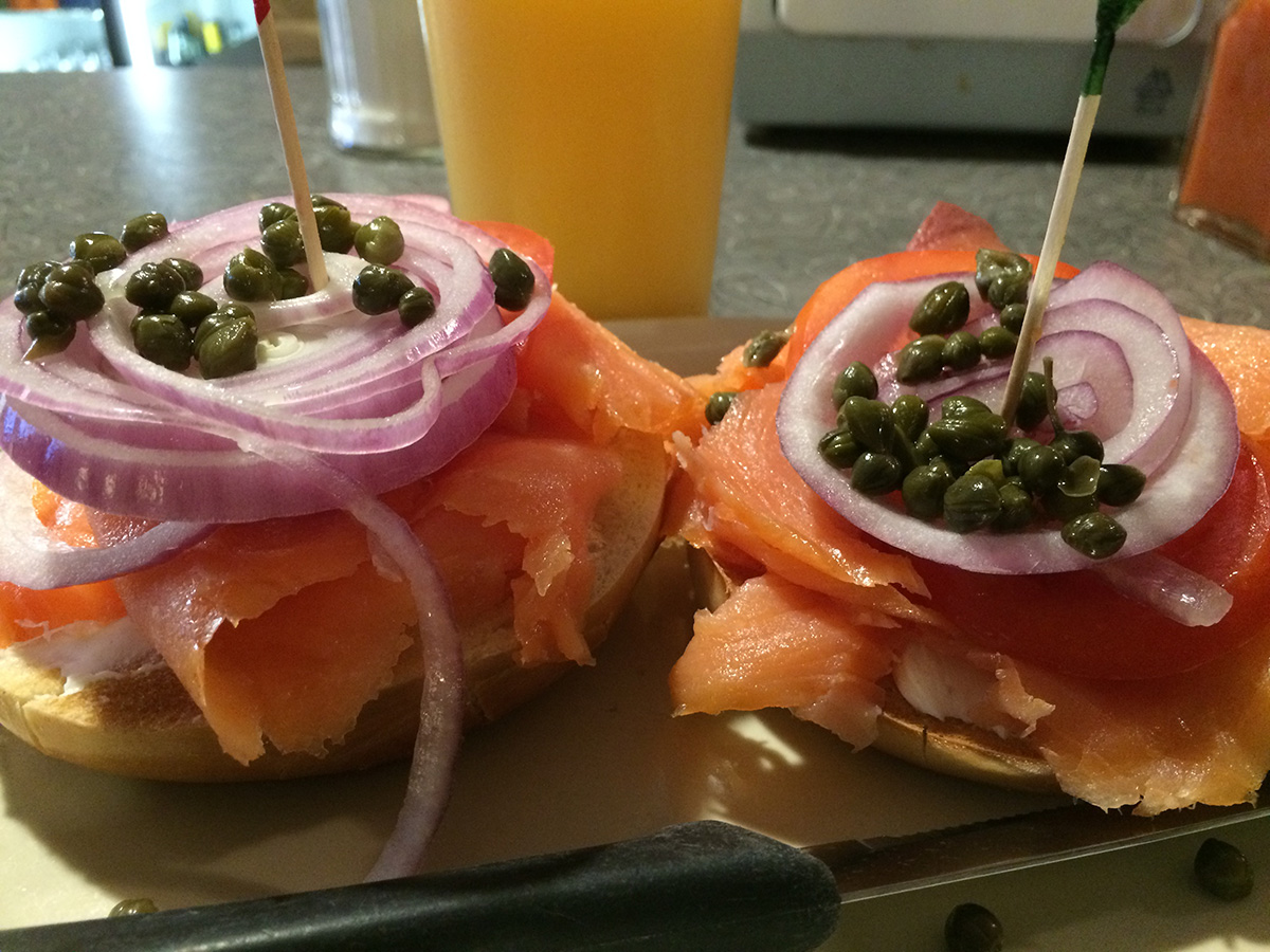 the main street bistro, that was serving breakfast. business was good as the place was crowded with customers; we grabbed a pair of seats along the counter. i ordered the bagel nosh - smoked salmon, cream cheese, tomato, red onion, capers all on a bagel $6.95 - with a fresh-squeeze glass of orange juice. i thought the sandwich was going to be a little thing but it ended up being like 2 sandwiches with meaty slices of delicious salmon. definitely a worthy breakfast before a long day's hike!