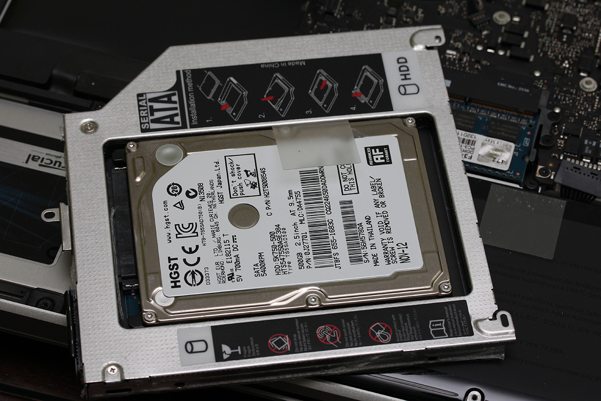 i finally held my breath and went ahead and installed the SSD hard drive (crucial MX200 500GB SATA 2.5 inch SSD CT500MX200SSD1 $140 into a 15 inch mid-2012 macbook pro 2.3GHz 8GB/500GB running OS X 10.11.1). it was a complicated affair of removing the DVD superdrive, swapping out the 500gb 2.5" HD with the 500gb crucial SSD drive, and finally reinstalling the 2.5" HD back into where the superdrive used to be using a hard drive caddy tray. i was worried about the tray because it seemed to be missing a plastic bracket, but it made up for it by securing the 2.5" HD using tiny headless screws. the HD also seemed to be too thick and wouldn't sit flush inside the caddy, so i was afraid i wouldn't be able to close the computer case. but everything managed to fit in the end.
