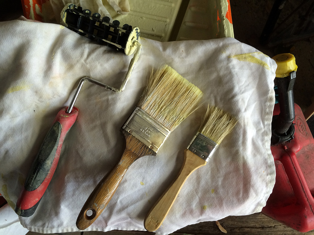 my initial impression of the color was that it was too yellow, but after it dried it looked okay, no hint of green. we worked from 10am to 2:30pm, with still at least a quarter worth of paint left in the can. while painting the eastern face of the garage, i even managed to use the roller for the very first time of housepainting this year (up until this point i was always using the more detail-oriented brush). even after priming the house looked a little rough, but this acrylic final coat really blends well and makes the house look super clean and brand new.