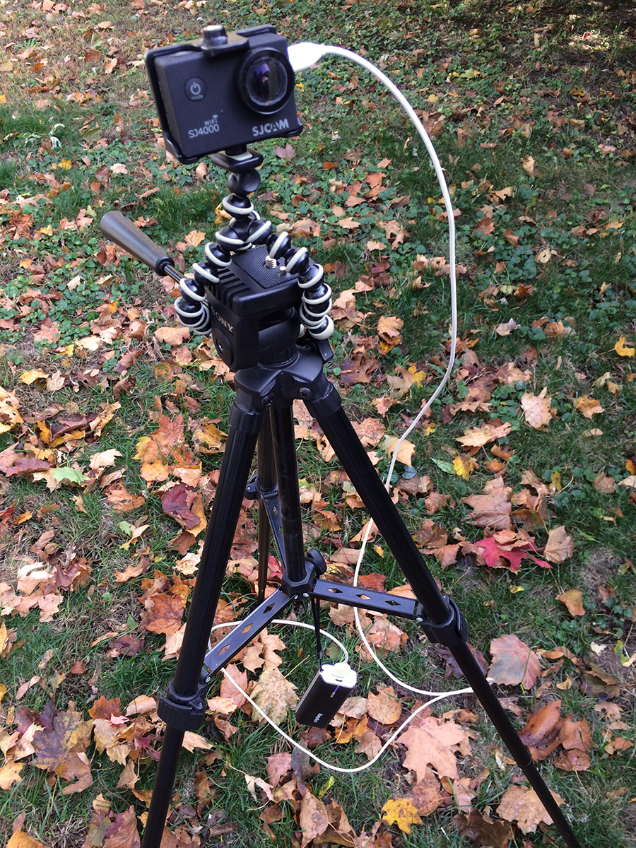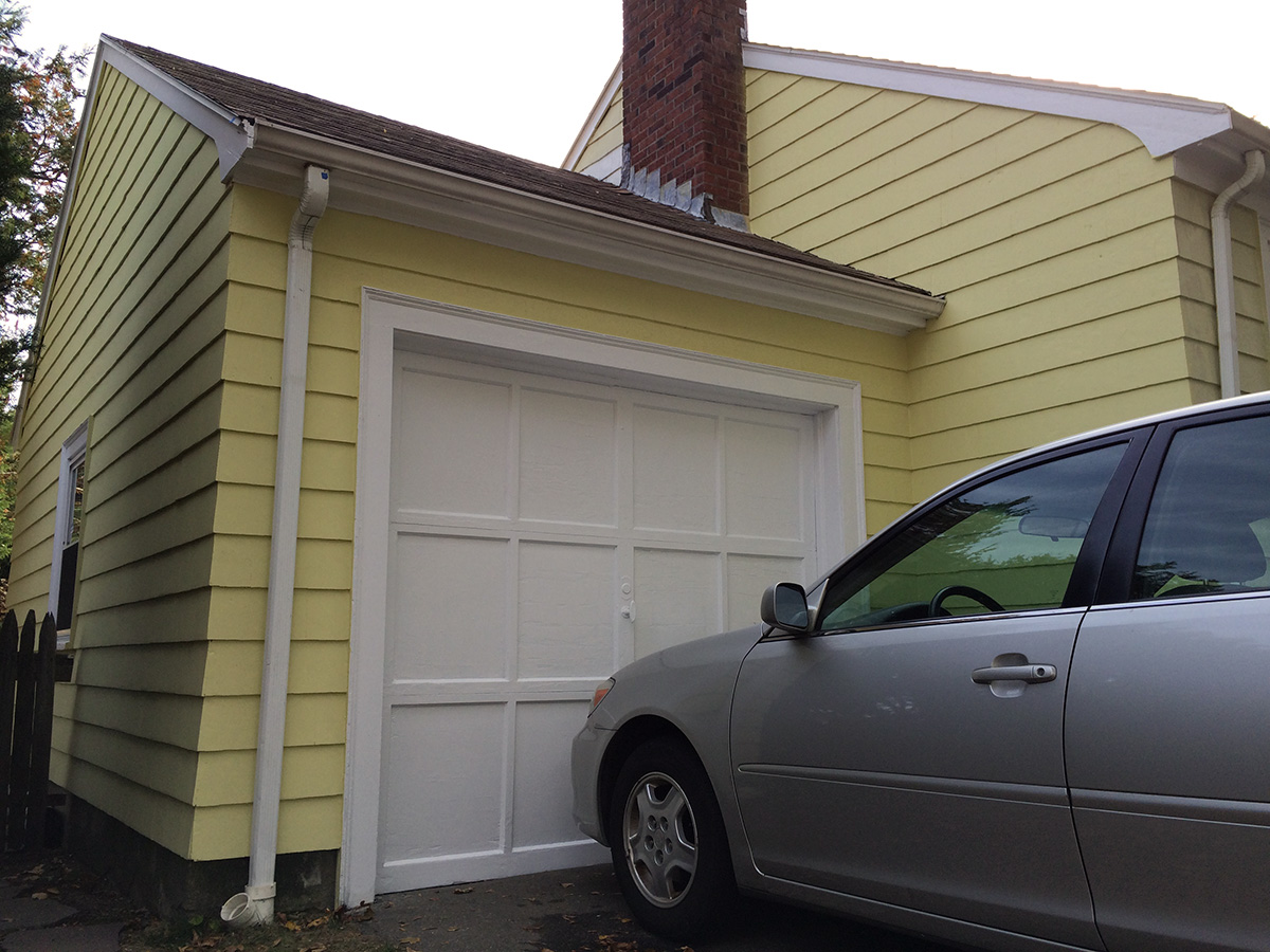 my father had already painted the basement windows with the final coat of semi-gloss white by the time i arrived in belmont by 10am. temperature gun reading said the house exterior was in the mid-40's, which was warm enough for acrylic. we opened the first can of final paint, sweet pear, and began painting the outside walls of the garage. while i edged with a combination of traditional and foam brush, my father was up on the ladder on the roof painting the corner area. the whole time i was also documenting our work with my action camera set on 1 sec time lapse.