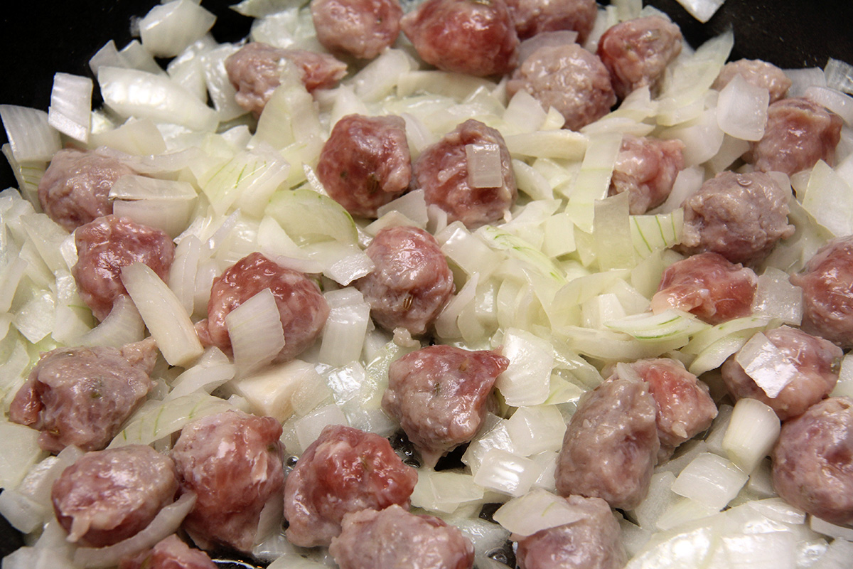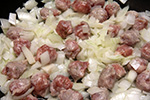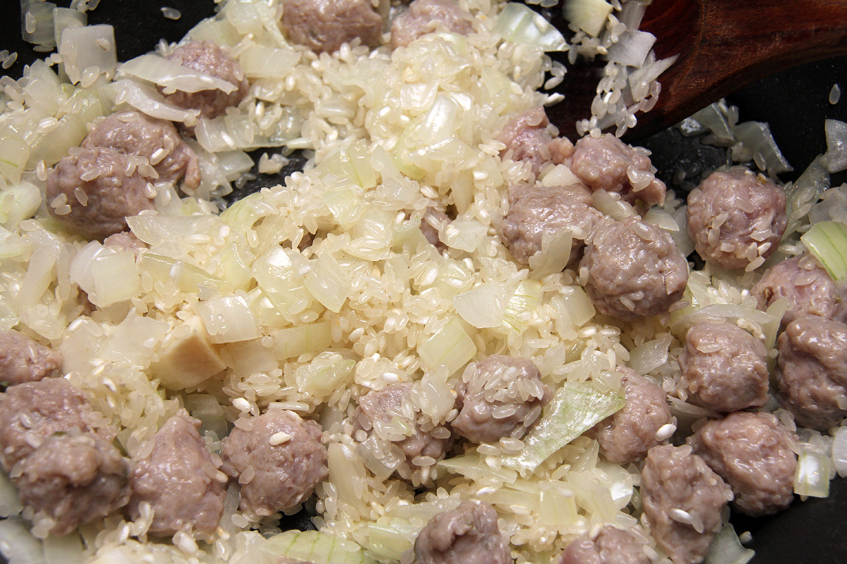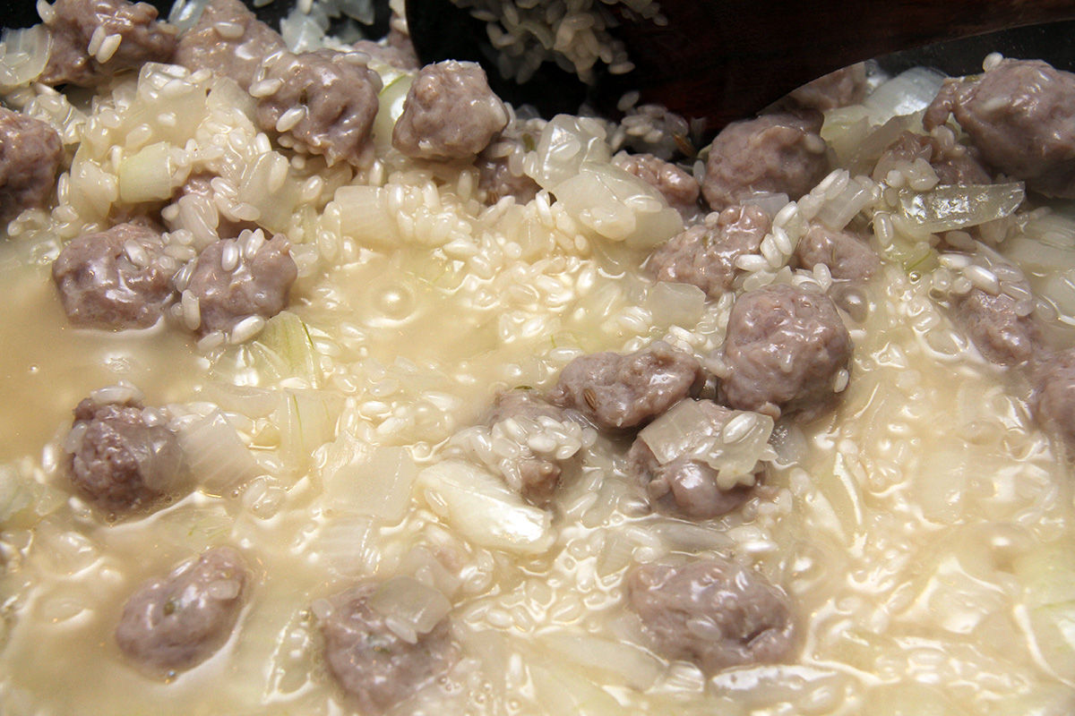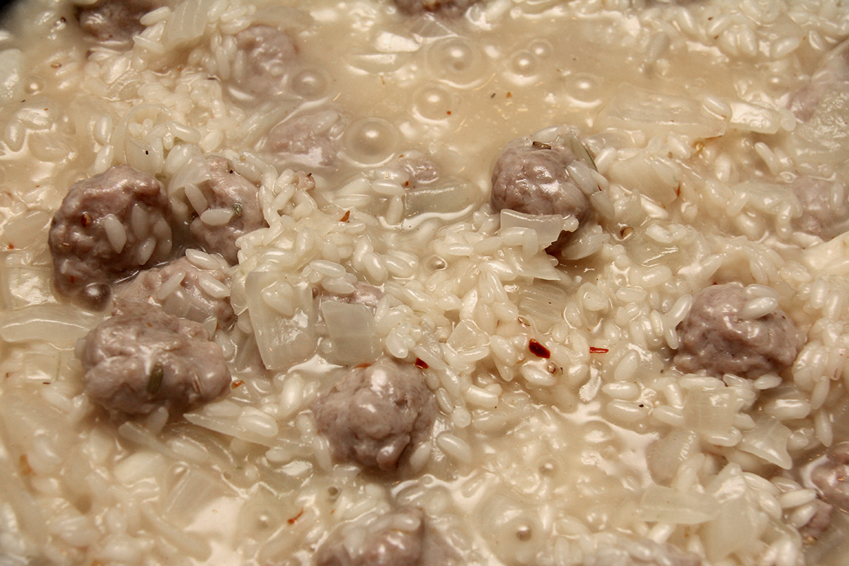begin by simmering 2 cans of chicken broth in a separate pot, covered. the broth has to be heated because making in the risotto in cold broth will lower the cooking temperature. you can either use 2 cans of chicken broth, or 1 can plus 1 can of water. once the broth begins to simmer, turn off the heat. in a larger pot, melt the butter and then add the chopped onions, followed by the sausages, which are squeezed from their casings into tiny meatballs. my risotto actually starts with sausages: if i see they're on sale, i buy them just to make risotto. once the onion is translucent and the sausages look to be cooked, add the arborio rice, coating it in the residual butter. then add the white wine, simmering until absorbed. add the pepper flakes and ground pepper at this stage as well.