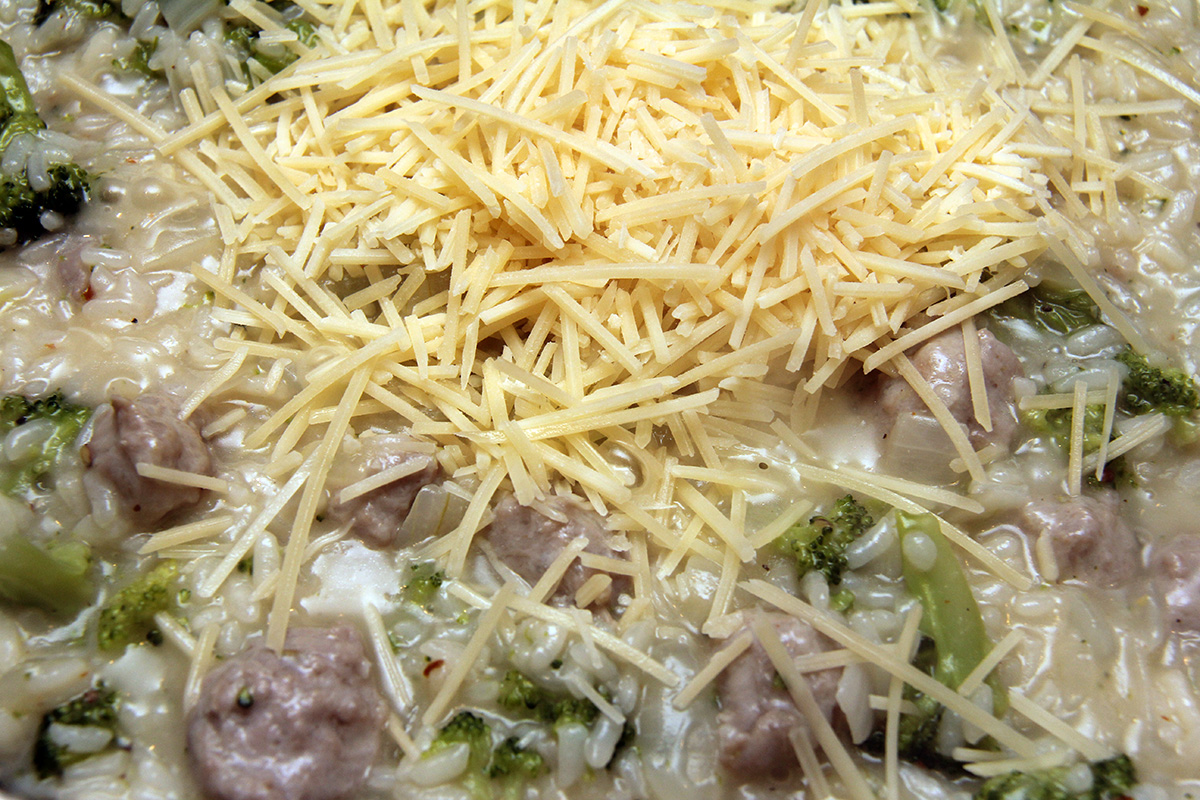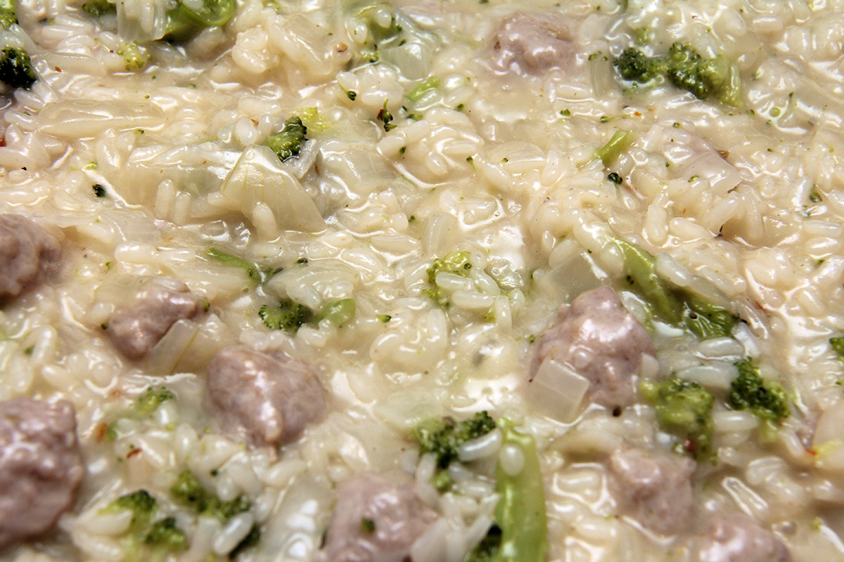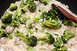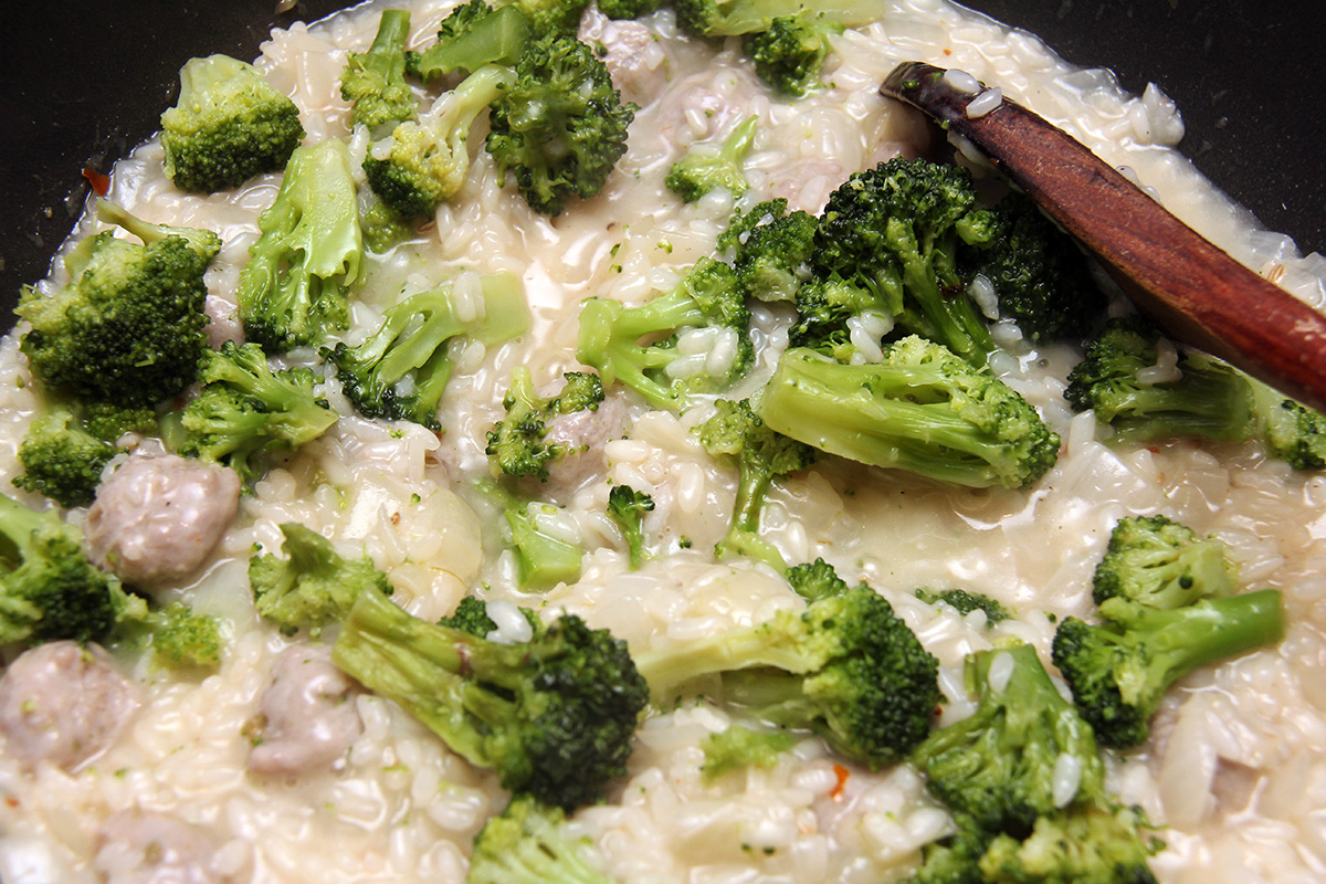 ladle 1/2 cup of warm broth into the rice mix and simmer until the liquid is absorbed. repeat until the broth is completely used up. also the risotto has to be constantly stirred otherwise the rice will stick to the pot. while this is going on, heat the broccoli in the microwave, 1-2 minutes, just enough to soften. overheating will cause the broccoli to get too mushy.