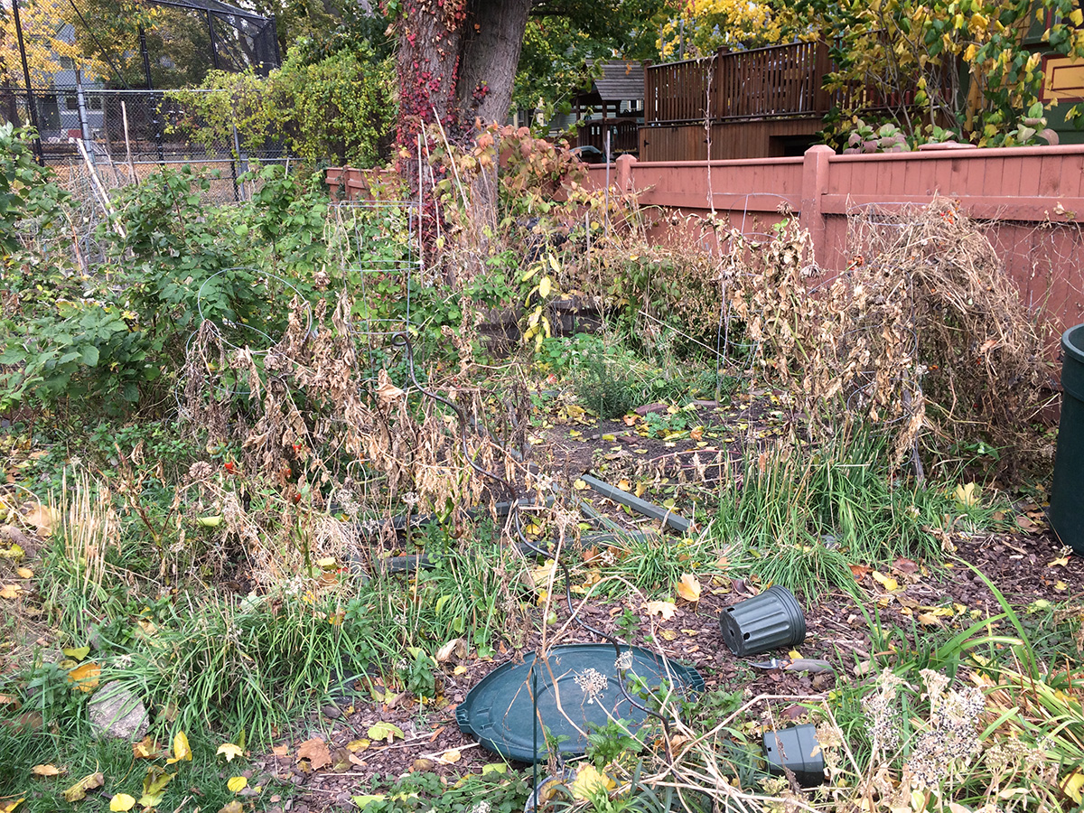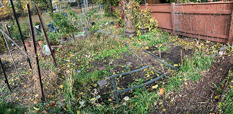 the last time i was in my community garden plot was back in late september. ever since we began to actually paint my parents' house (prime and final coat), i haven't had any time to visit the CGP. when the weather was nice i was painting, and when the weather wasn't very nice, i was at home but didn't feel like going out. there was nothing left to harvest in the garden anyway, so it wasn't a high priority. but it's the gardener's duty to clean up after the season is over, so today i finally found the time and went down to the garden to see what my 6 weeks of neglect had wrought.