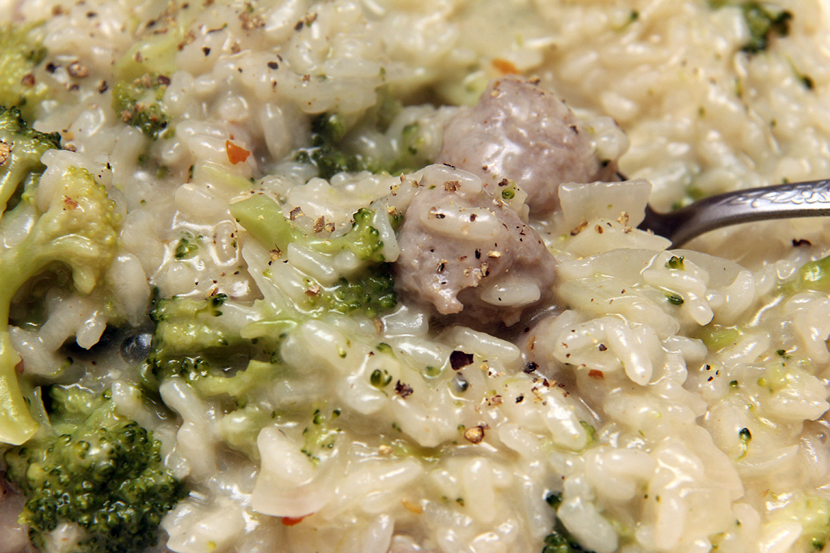 despite being a personal favorite, i never wrote down a detailed ingredients list. i had to piece it together from clues left behind in past weblog postings (111222 first time making 120412 steamed broccoli 120419 red wine risotto 120731 anchovy risotto 130224 vodka risotto). i didn't know how much arborio rice to use, nor the amount of chicken broth (1 can or 2 cans?).