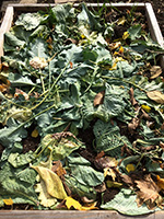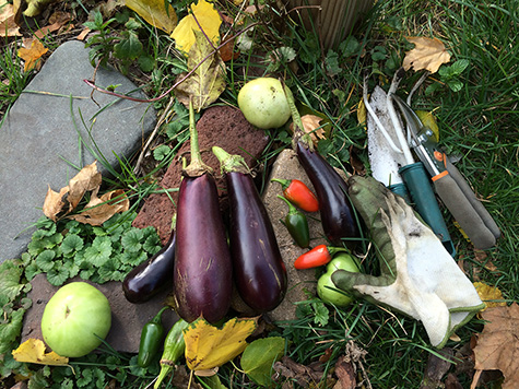 i pulled up all the dead plants and threw them away in a garden refuse bin. next i pruned all my raspberry canes. i forgot what the rule is, but pruning them down to about 2-3 ft tall as least made the area look presentable. surprisingly, i was also able to harvest a few leftover vegetables, including several eggplants, green tomatoes, and red jalapeno peppers. finally, i dug out my rosemary so i can keep it indoors during the winter.