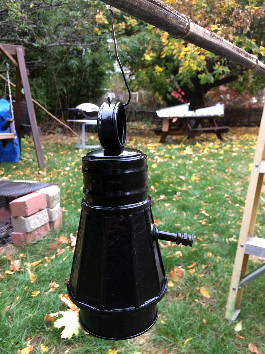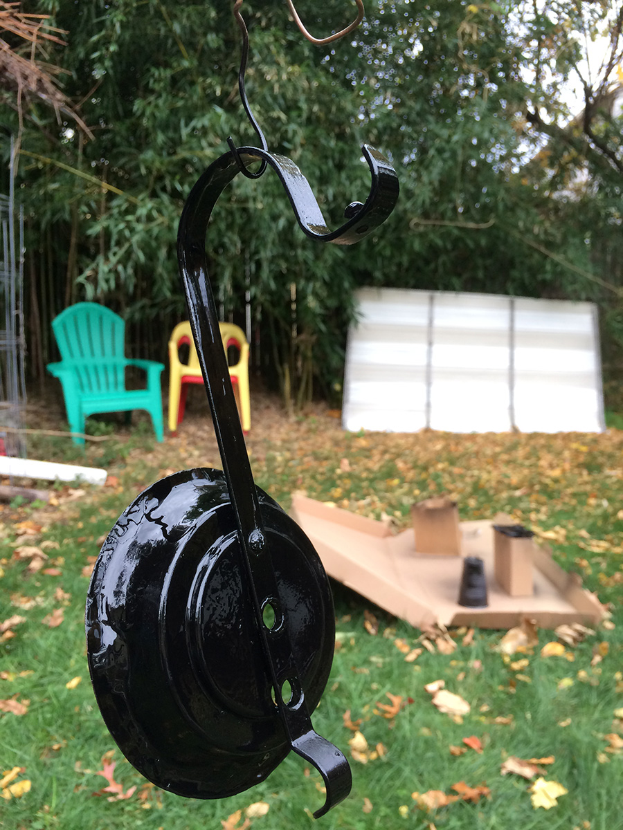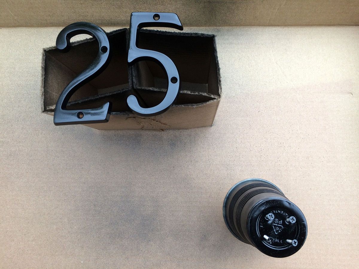 when we came back we colored some front door equipment with black spray paint: the porch light and the house numbers. my father rigged up a rack so we could spray the hanging light parts. my father wanted to install the awning as well, but the wooden posts needed another coat of paint before they can be attached to the house.