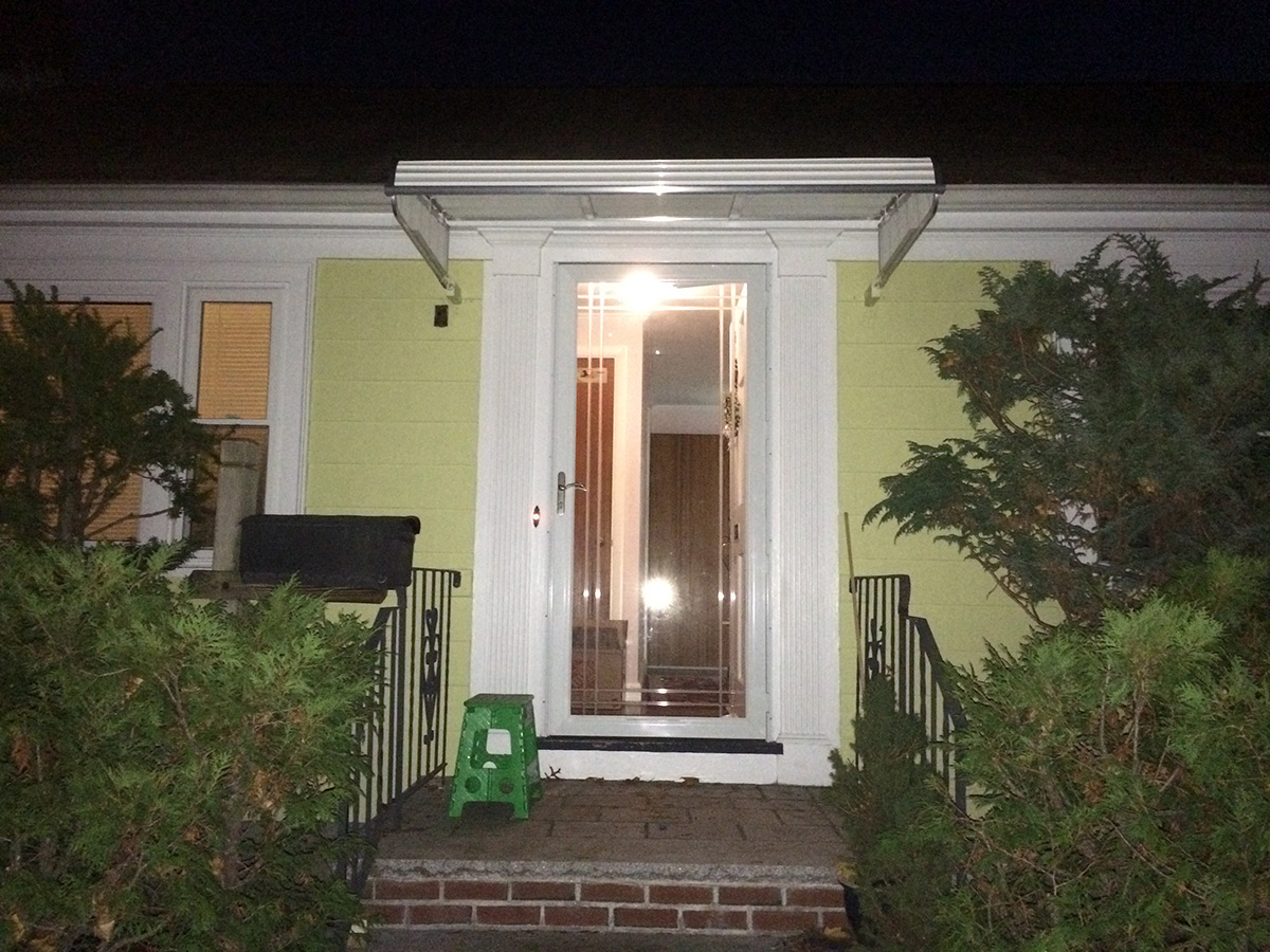 i waited for my parents to come home (around 3:30pm) so my father and i can finally install the new awning. once we slid the awning into the bracket we'd already nailed into the house fascia a few days ago, we could prop in the wooden brackets and the awning could hold on its own before we screwed everything into place. we took a long time to measure with a leveler,