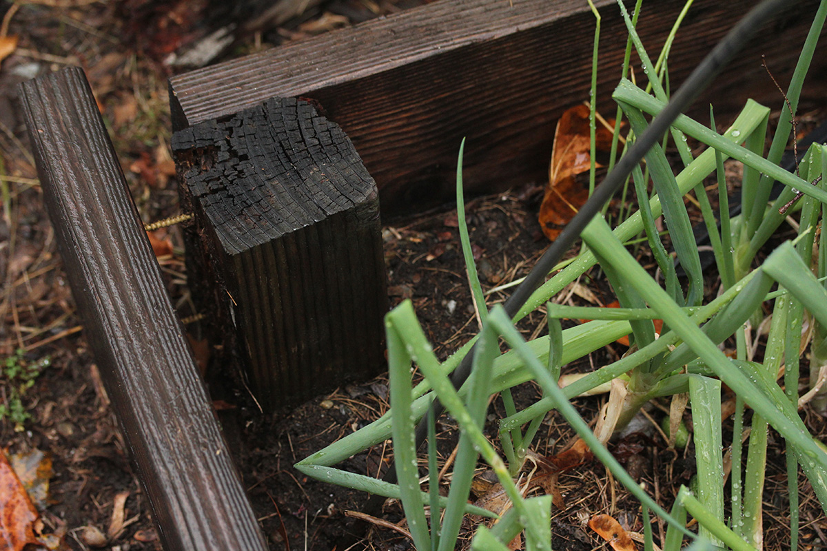 raised bed 3 (RB3) needs to be repaired: ravaged by termites (now eradicated), the corner posts have been eaten away and one of the sides has fallen off. we need to get a few l-brackets and nail everything back into place.