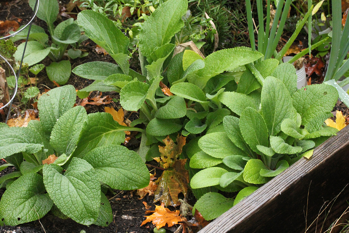 i'm still pretty amazed by the foxglove plants; they do well in the shade, resistant to insects, and seemingly impervious to frost. when the weather clears up i'll need to divide up the plants and transplant them to better locations away from the raised beds. the leaves appear big and soft, but there's a leathery toughness to them which would explain their hardiness. they are also poisonous throughout (only if you eat them) so maybe that's why bugs don't bother them.