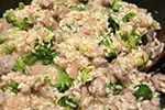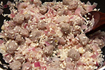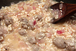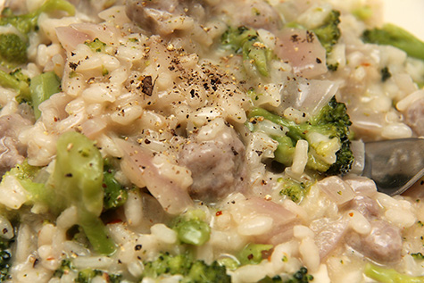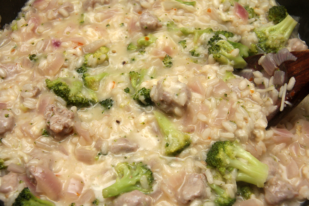 i decided to make another batch of risotto for dinner, simply because i had some leftover raw italian sausages in the fridge that i needed to cook before they went bad. i used just a single can of chicken broth, added another can of hot water for volume; honestly, i can't tell the difference between 2 can of chicken broth versus 1 can broth + 1 can water. i also had to run out to star market very quickly to grab a red onion. as for the frozen broccoli, i zapped it in the microwave for just 2 minutes. some parts of it was still a little frozen, but i let it sit on the countertop while i stirred the risotto, and everything sort of thawed out on its own, and didn't matter once i tossed it with the risotto towards the end.
