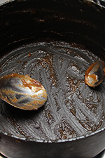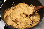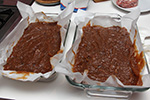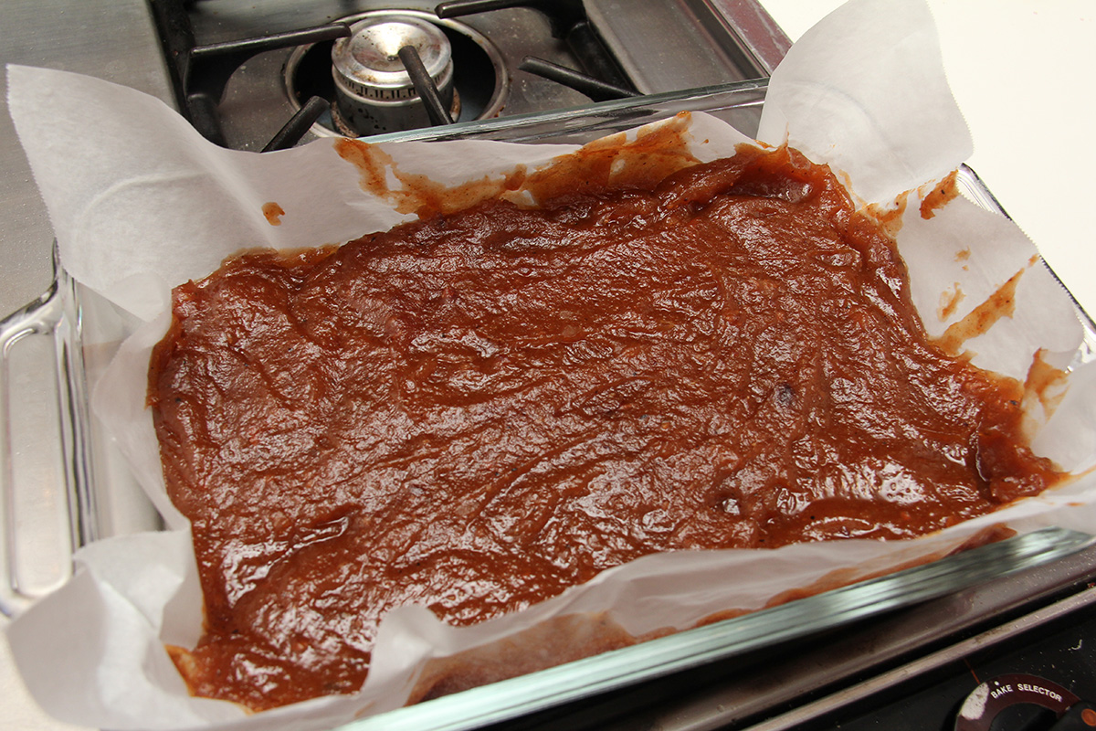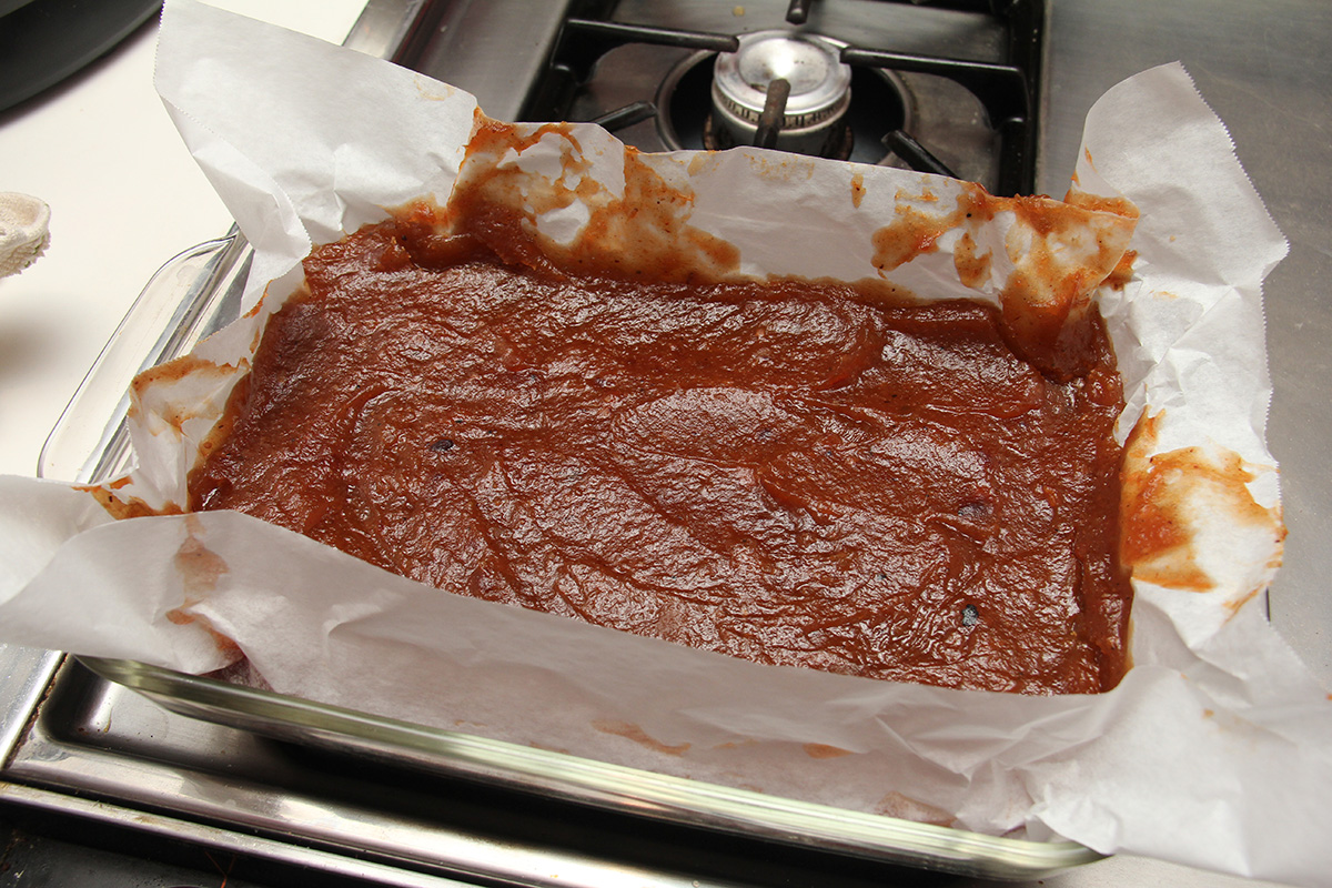after 1-1/2 hours the quince puree was finally finished boiling. it wasn't a deep rose color at all, but rather this brown mixture with maybe a hint of red. maybe it's because i used very dehydrated pulp, maybe it's because i waited almost 3 weeks to finally use the pulp for membrillo. whatever the reason, my finished puree didn't not resemble any of the known recipes. i scooped the hot sludge into 2 parchment paper lined lasagna dishes and put them into the oven to bake for an hour at 150° (the lowest temperature setting). the mixture still looked sort of soupy, and i wasn't confident it would solidify, but i gave it shot nonetheless.
