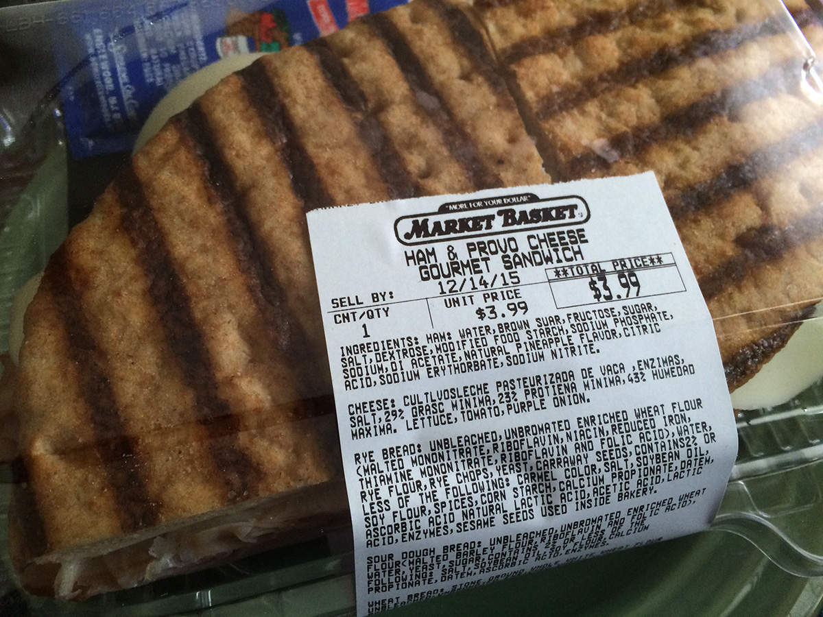 on our way back, we stopped in market basket. i needed to get some groceries (most importantly eggs for my pastel de nata recipe i'd be trying later today) while mauricio needed to pick up lunch and some snacks for his busride to new york city in the afternoon. yesterday alfonso had already taken mauricio into his first american supermarket experience (the whole foods on cambridge street next to MGH), but i was showing him a more local side of grocery shopping. i could feel mauricio experiencing sensory overload. in spain his used to smaller grocery stores, with less selection. besides the abundance of choices we have here in the US, a visit to market basket is also a patchwork of different shoppers from a myriad of cultures, all converging at the same "watering hole." mauricio seemed less inclined to explore than trying to accomplish his mission of getting lunch and snacks and drinks. as for me, i opted to get a store-bought lunch, the ham and provolone gourmet sandwich for only $3.99.