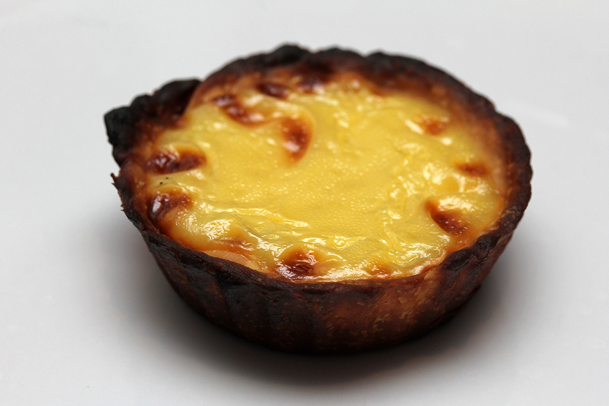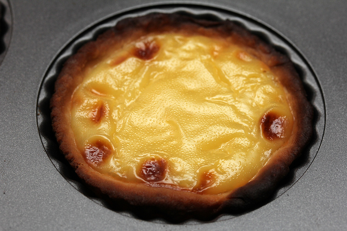once the pastel de nata was properly cooled, i tried one. i was worried the pastry would stick to the tray, but the baking had turn the crust into a hard shell that it simply popped out. the crust was dark, not yet burnt but close. the filling wasn't very good either: the consistency was okay, but it tasted way too sweet, definitely have to pull back on the sugar next time. i still had some mixture left over, which i poured into a ramekin and baked it for 20 minutes to make a custard-filling pudding.