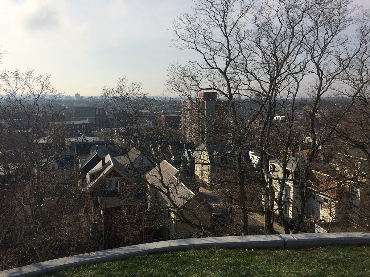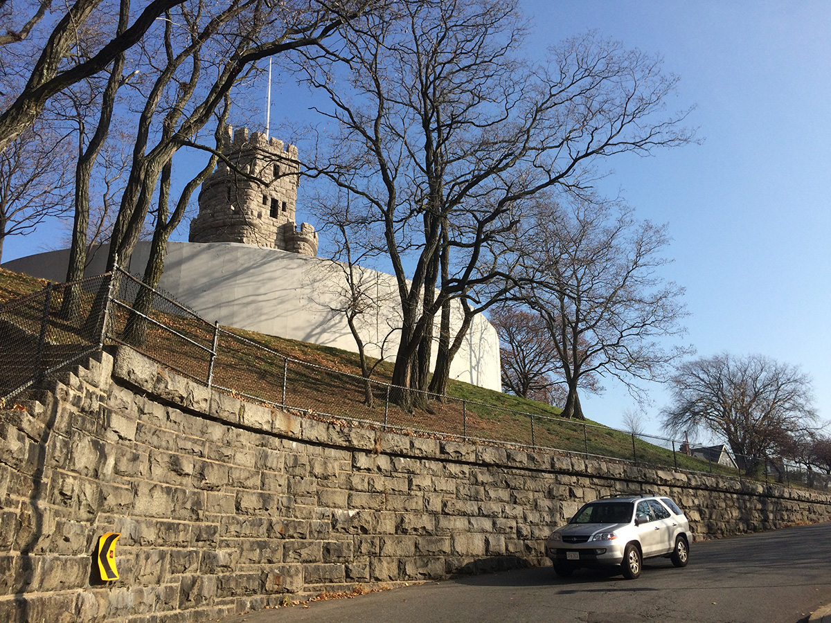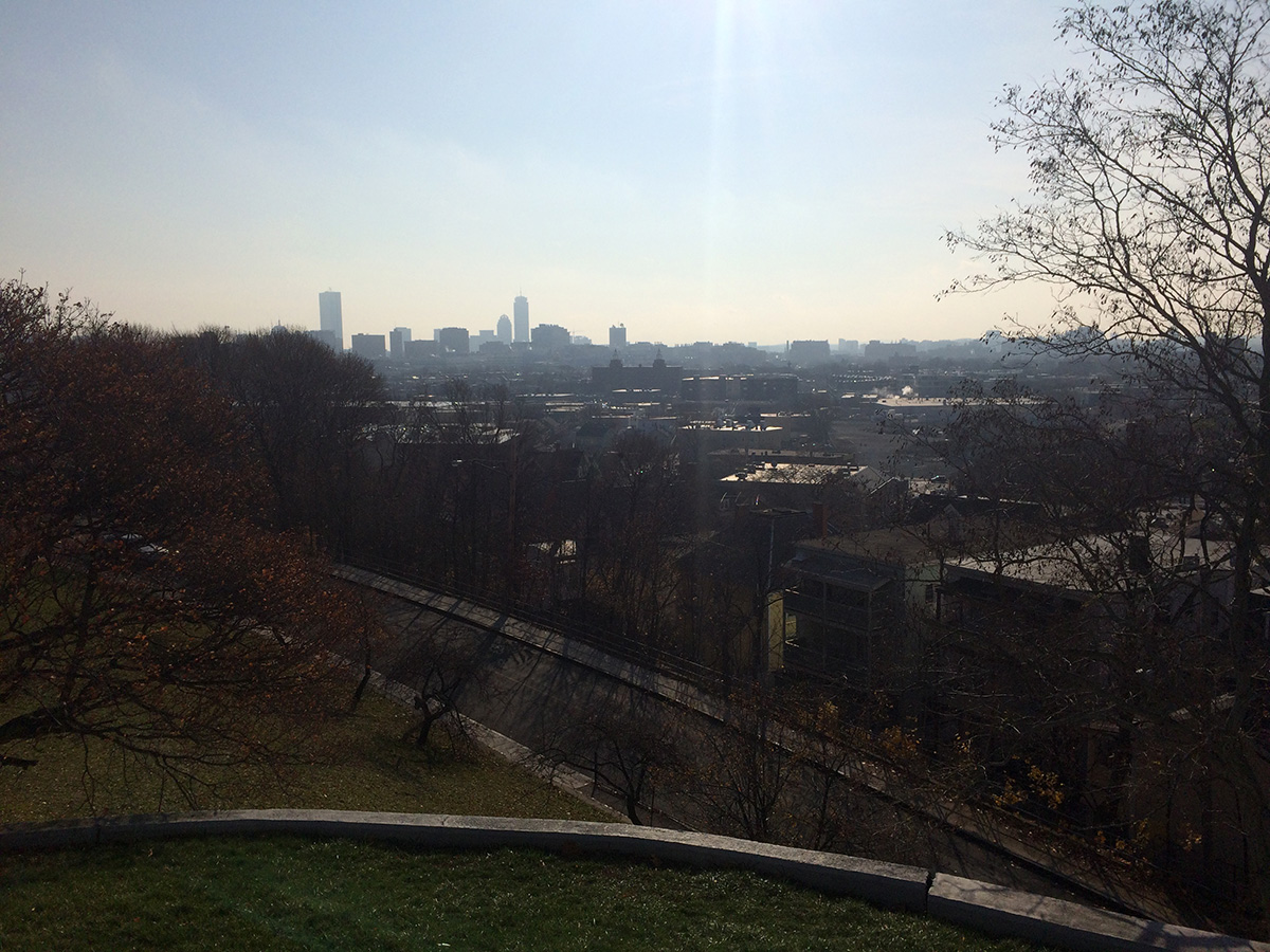 around 11am i took mauricio to prospect hill park in union square to get a bird's eye view of boston and the nearby landscape. along the way i wanted to show him points of interest, but a few times he kept on talking about something else and i didn't want to interrupt him. he seems to be more interested in chatting than actually sightseeing. of course anyone who rarely takes photos is probably not the most observant when it comes to noticing things anyway. the tower was undergoing renovations, but we stepped over the barrier tape undetected, as the workers were busy inside the castle itself to notice us. mauricio seemed to really like the view and kept thanking me for showing me. i think he's the first of my roommates that i have ever brought up here.