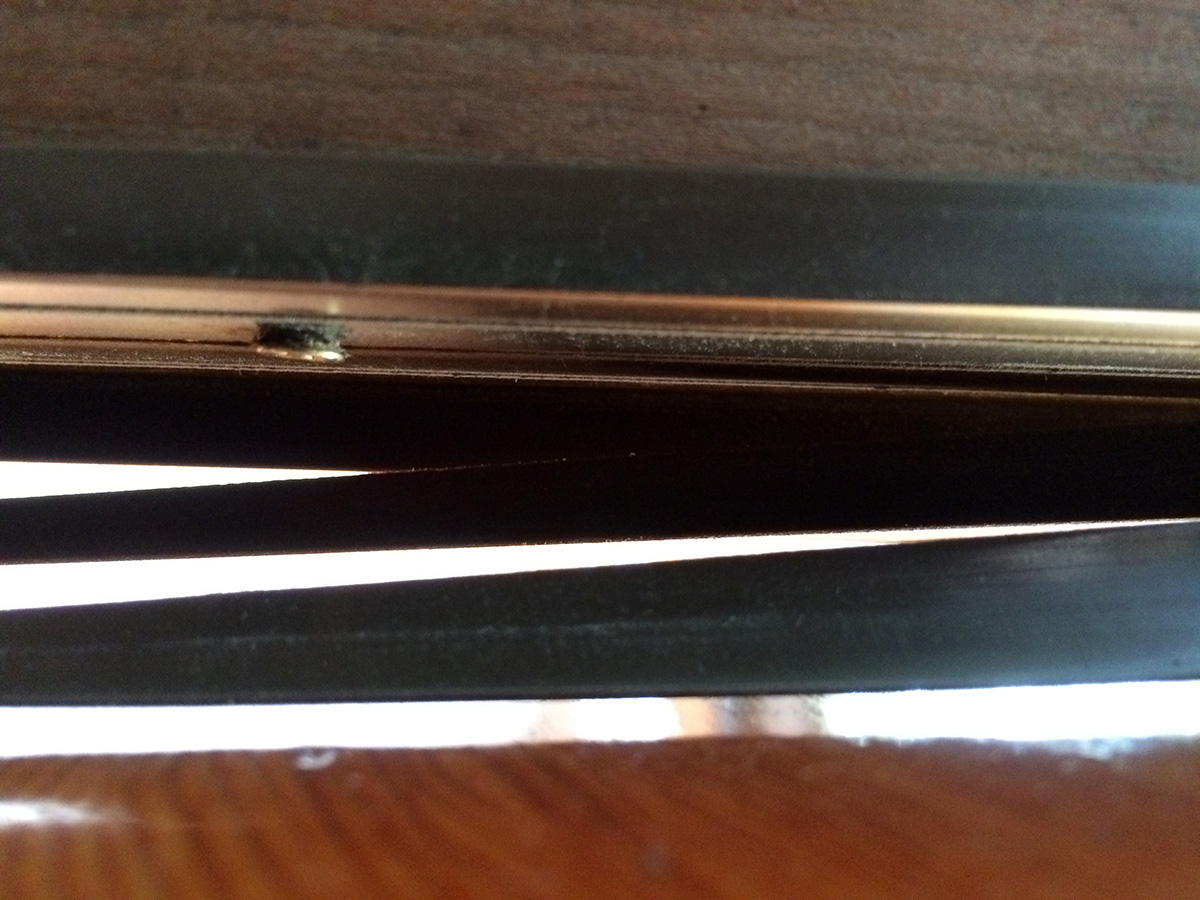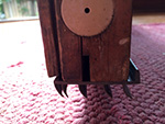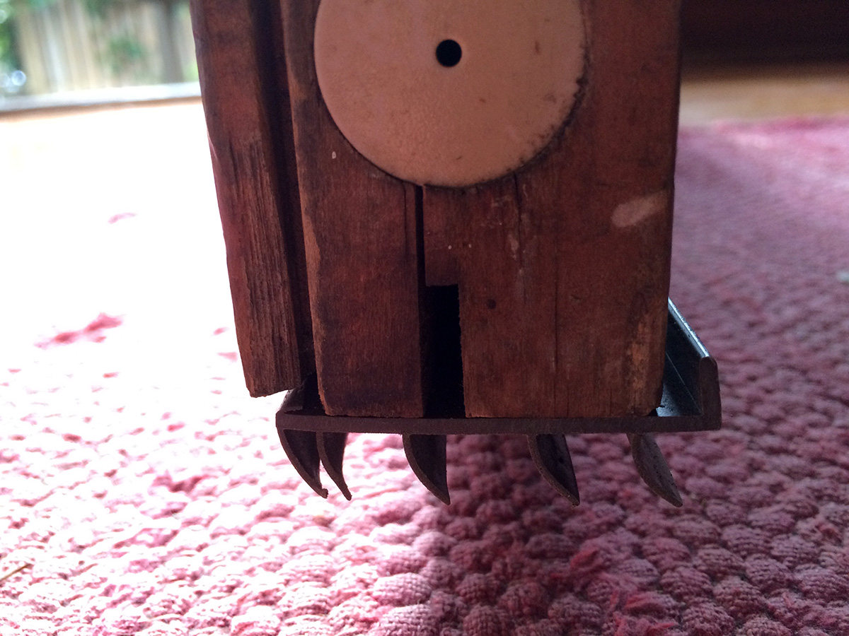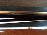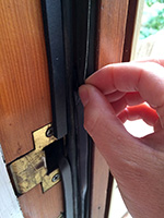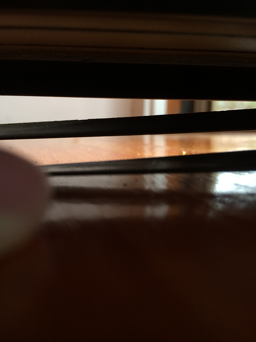 i knew of it yesterday, but today i had more time to carefully inspect the new door bottom on my backyard door. i knew a fin or two had already ripped off, courtesy of my previous roommate ana, who went out constantly throughout the day to smoke. what i didn't know was the extent of the damage. the bottom originally had 5 fins: i discovered that 3 of the fins were already gone, and all that was left were two of the outermost fins. those two fins don't bridge the gap (due to my weirdly sloping threshold) so they're allowing the cold air to come in. i was hoping i could replace the door bottom, but my father didn't seem to be interested in helping (it's a hassle involving removing the door completely) and suggested i use a doorsnake in the meantime.