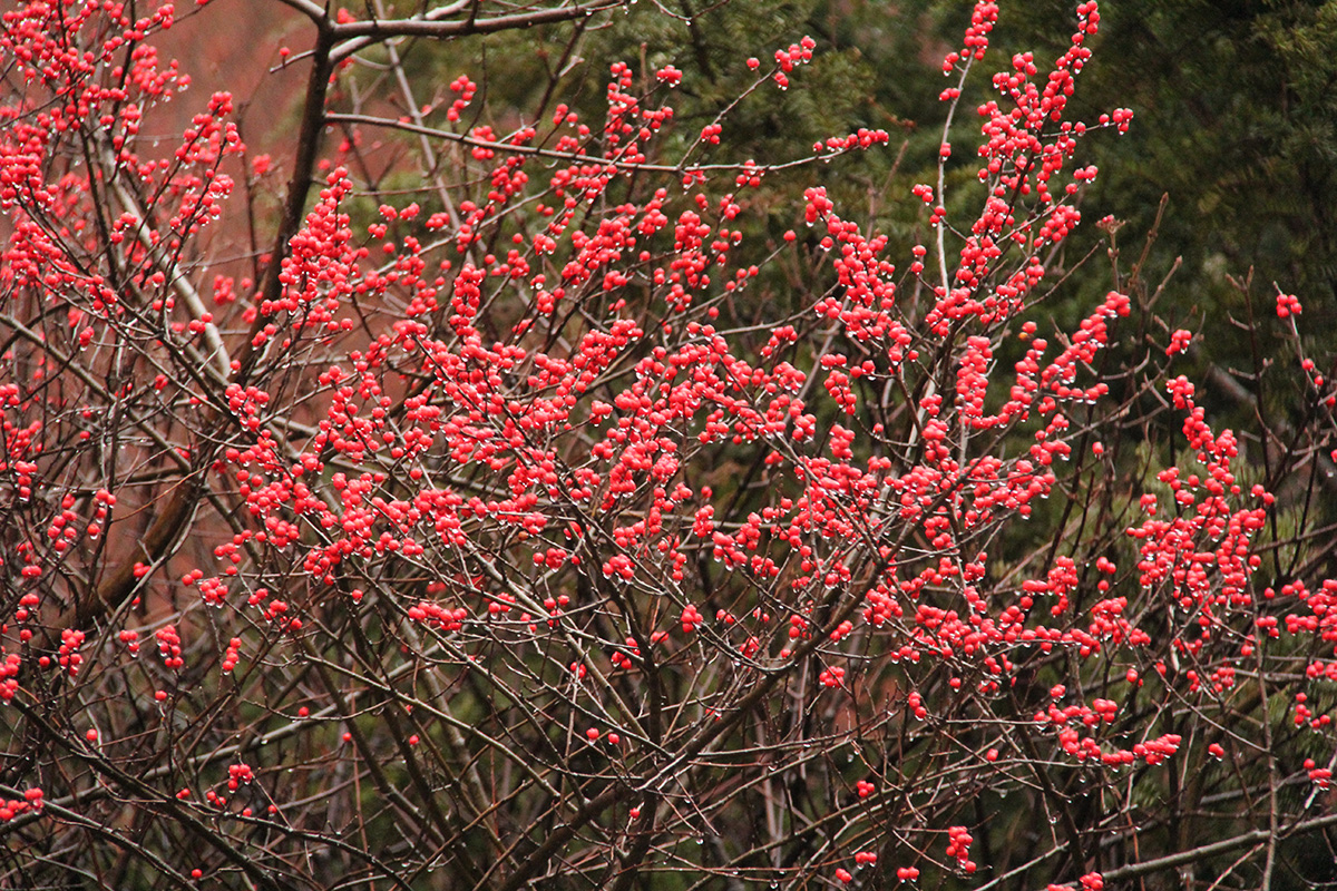 i saw a lot of red buds on trees that i thought were flowers from trees confused as to what season it was due to the recent stretch of warming weather. but upon closer examination i realized they were red berries, not flowers. so the trees haven't been tricked after all it seems.