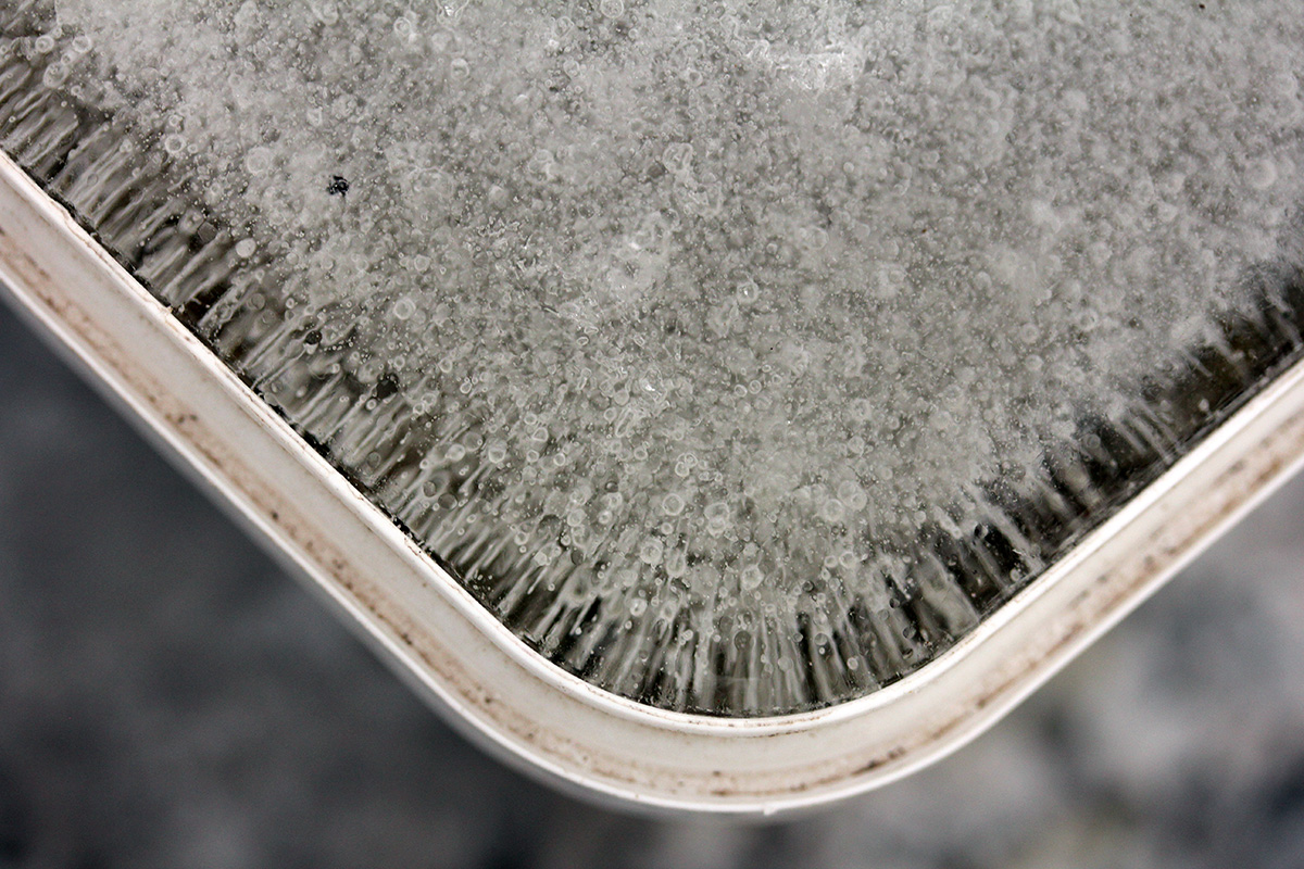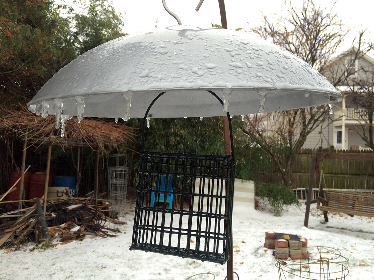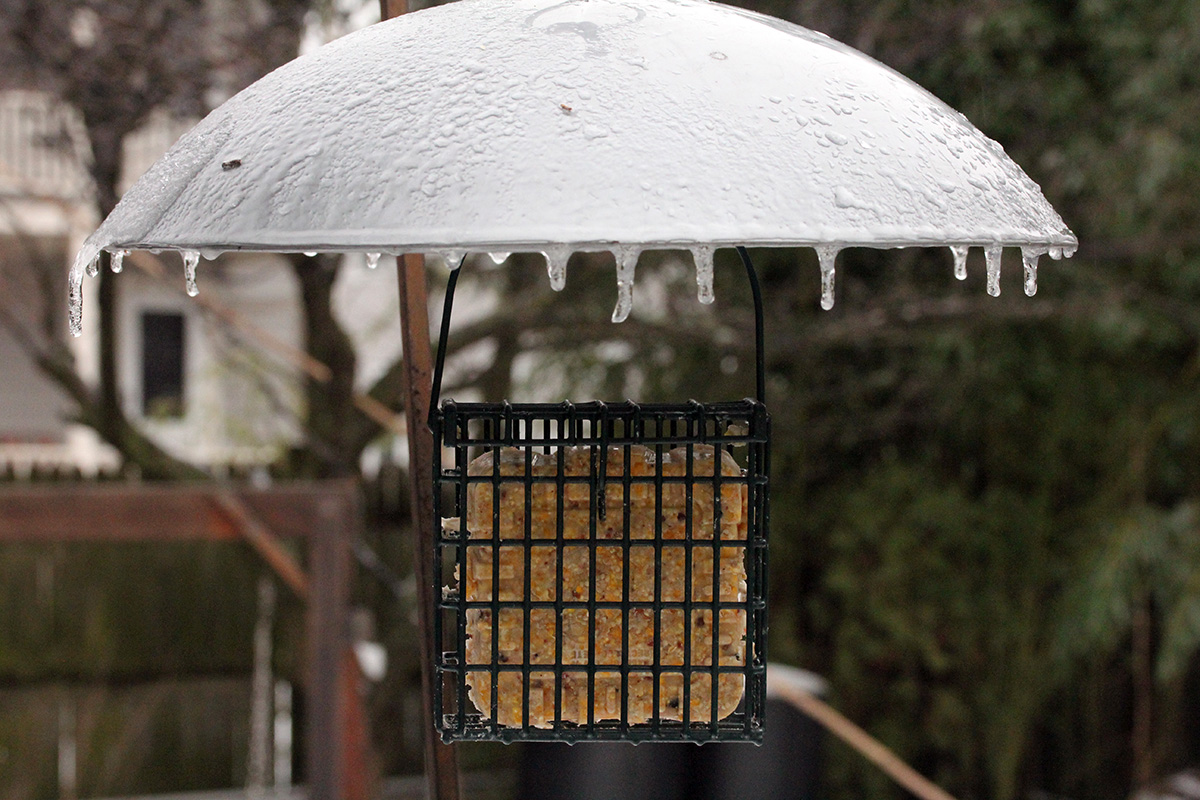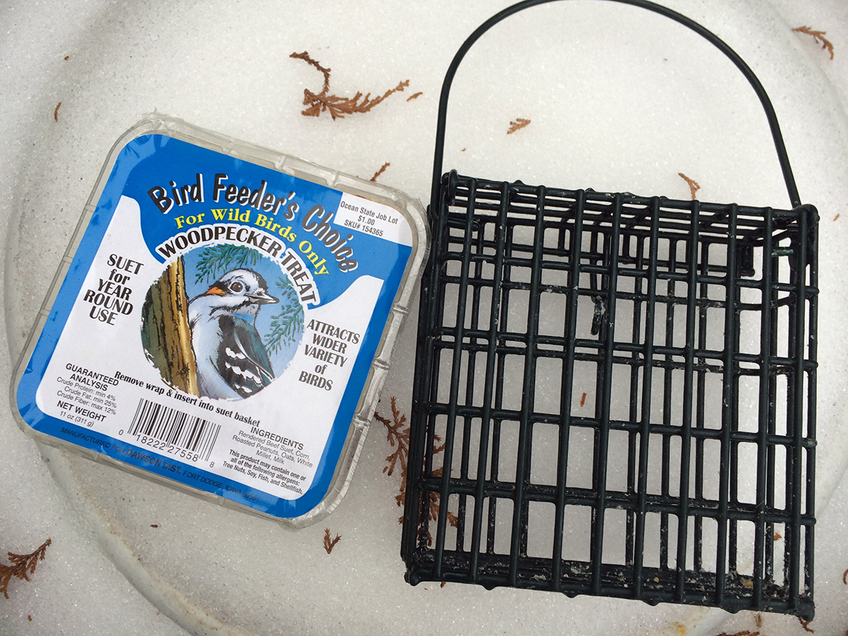 i was hoping to see some birds at the suet feeder but the feeder was empty, that last piece of suet finally eaten, either yesterday (during the storm) or earlier today. i climbed down the icy steps and put in a new suet block, "woodpecker treat." i heard birds chirping overhead but couldn't see them. later from inside i saw some sparrows coming to the feeder, which i promptly scared away. i didn't see any other birds after that.