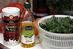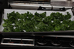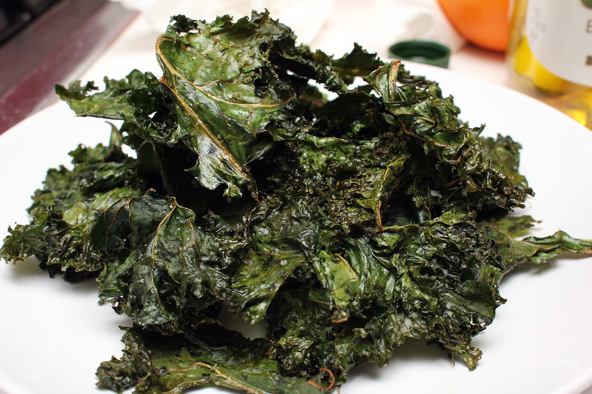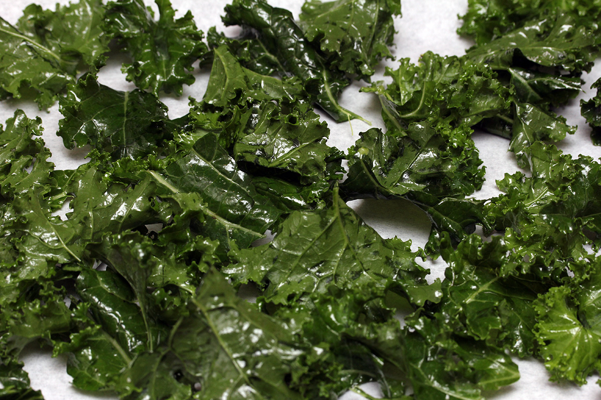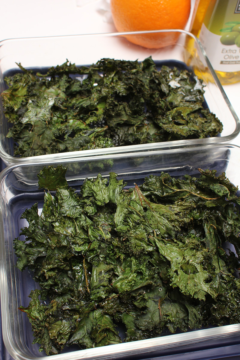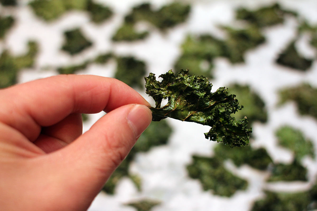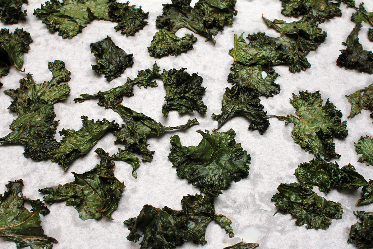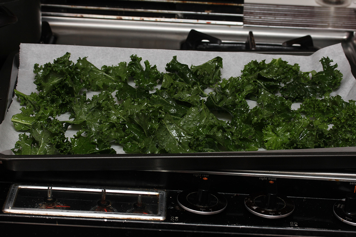 with half a bunch of kale i managed to make 3 batches of chips. since i was using the oven anyway, i put in a pan of sweet potato as well on the bottom tray (50 minutes). i tossed out the kale stems before reading that i could use them in a smoothie so picked them back out of the trash can. 25 minutes to bake a tray might seem excessive, i'll probably make them for less time next time. the chips were crispy, but almost too crispy, sort of falling apart in my mouth as kale dust.