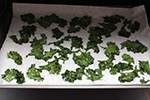 i tried making some kale chips today. i had some before, something my sister had made. i figured it'd be a healthier alternative to my usual processed snacks. i looked up a bunch of recipes and came down to this one: cut kale leaves from stems, ripped into sizable pieces, wash and then dry in salad spinner, hand-rubbed with a bit of olive oil and kosher salt, layered on a parchment paper covered baking sheet, and baked for 25 minutes at 300°F.