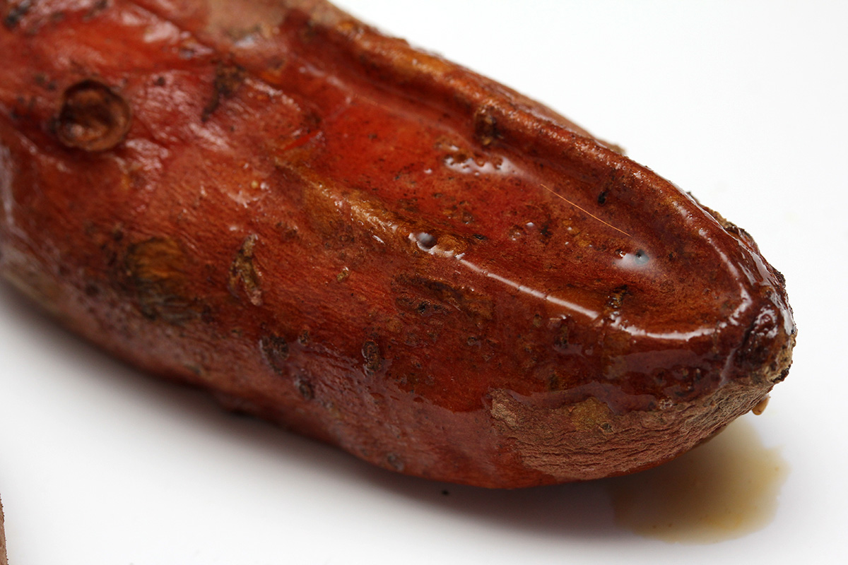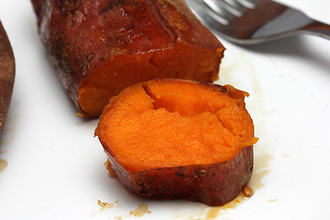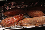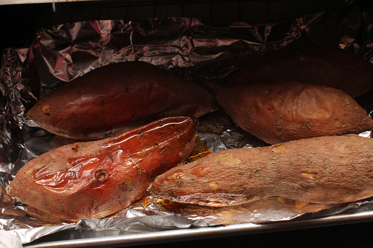 finally, i finished cooking my sweet potatoes. even after 50 minutes at 300°F in the oven they weren't ready, so put them in the toaster oven at 350°F for another hour. after 30 minutes when i went to go check some of the spuds were already leaking syrup. after an hour i turned off the oven.