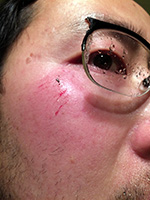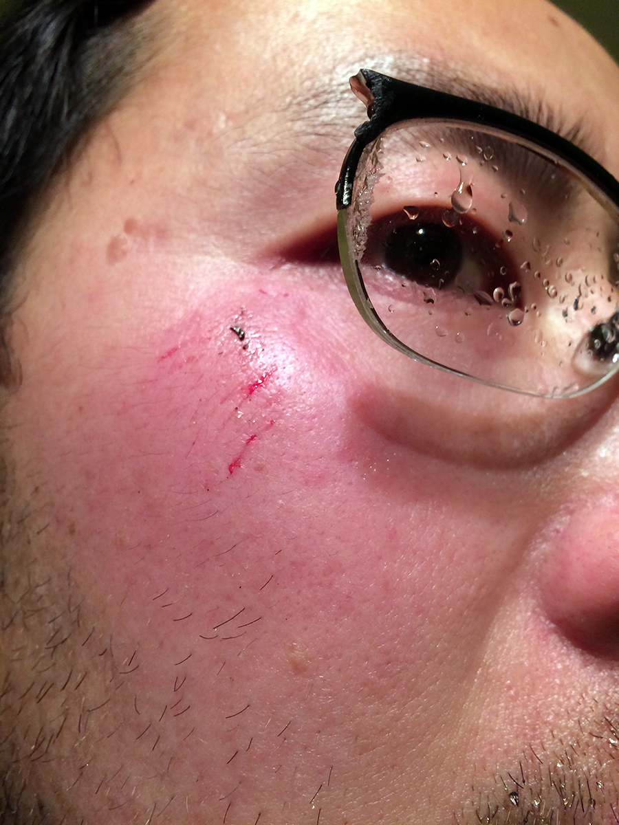 after parking the bike in the basement i took a selfie to inspect the damage. my face seemed okay, but the right arm of my glasses had snapped off. the only reason why my glasses didn't fall off my face was because my head was so bundled up, that it sort of held the glasses in place. back upstairs inside the house, i went in the bathroom to get a better look at my face. there were some scratches on my right check (some embedded gravel too), but otherwise i seemed to have escaped injury free. after washing the wound, i put some neosporin on it. i figured it'd bruise by tomorrow.