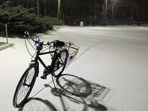 i follow the weather pretty diligently, so i was surprised when it started snowing in the evening. was this in the recent forecasts and i just happened to miss it? maybe it'd be a dusting at most, but enough snow fell that the road was covered in a thin layer of white, and more seemed to be coming. i actually like riding in fresh snow, seeing my wheels carve a trail. i couldn't help but to look back a few times, admiring my handiwork. all was well until i arrived at observatory hill. the photo op was too good to pass up, a white parking lot with a line cutting across it courtesy of my bike wheels. i spent a little longer than anticipated, because my iphone was telling me i'd run out of storage space, so i had to switch to my oneplus one phone (the photos aren't as good). once finished, i got back on the bike, content in my admiration for newly fallen snow. that good feeling only last for so long: as i was rounding a corner going downhill, my wheels slipped in the snow and i crashed to the ground.