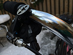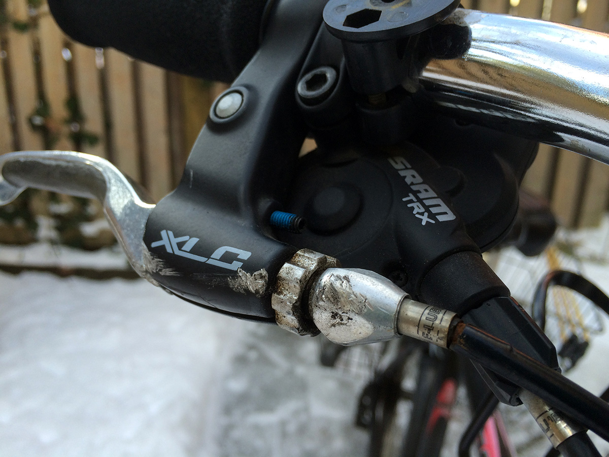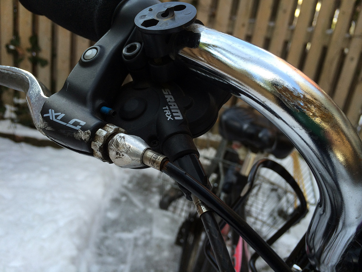 despite wiping out last night, it didn't make me gunshy about getting back on the bike. if anything, today would be a good day to ride, with fresh snow still on the ground, before it melts and turns to ice within the next few days. maybe take it slower on turns, and i'll definitely keep my eyes open for slick patches. i took out my cargo bike from the basement and inspected the damage. i knew the bell had broken off, but now i could see the fresh scratches on the handlebar and brake lever. i used a piece of tinfoil to rub out the "rust" from the handlebar scratches.
