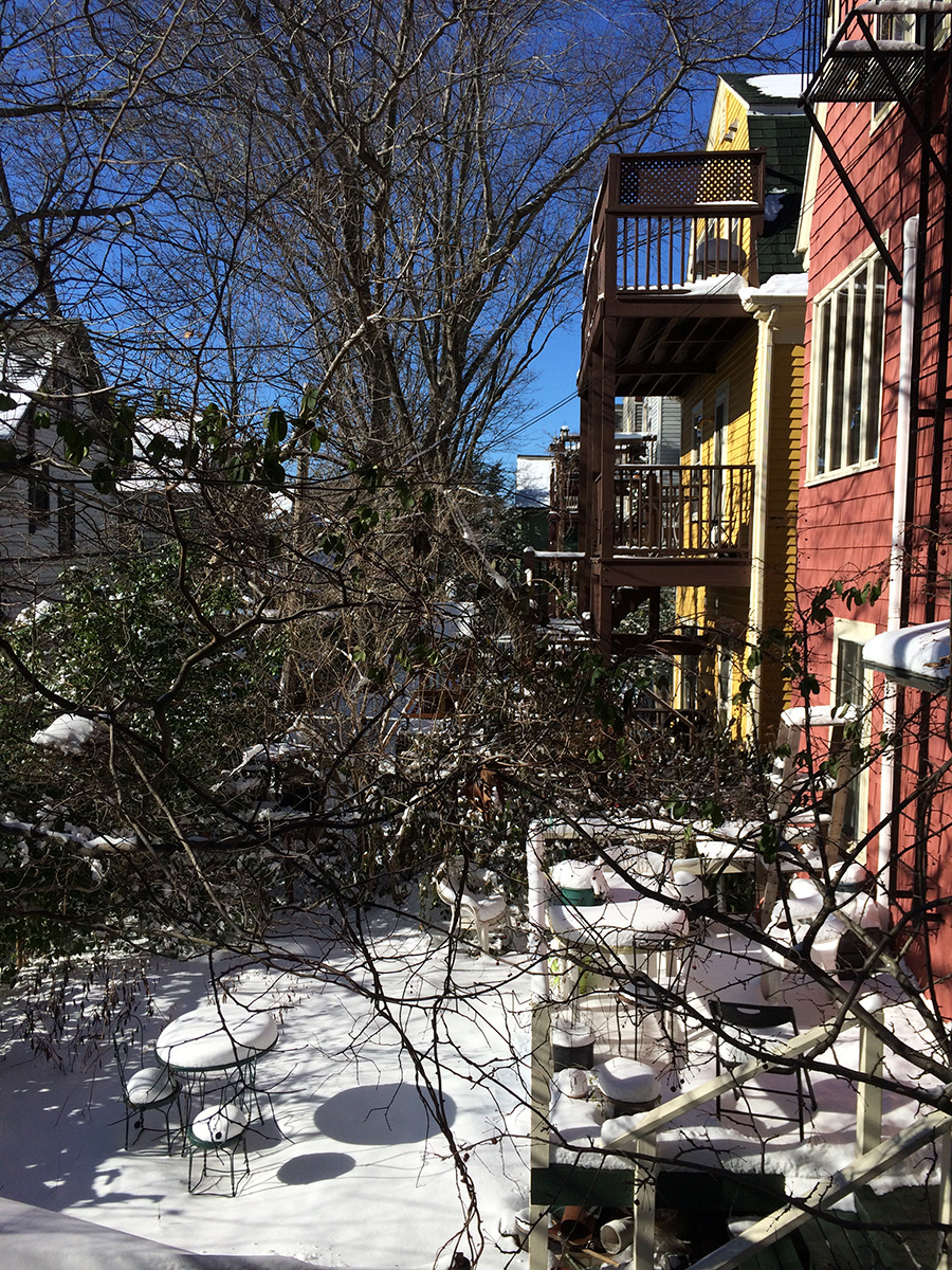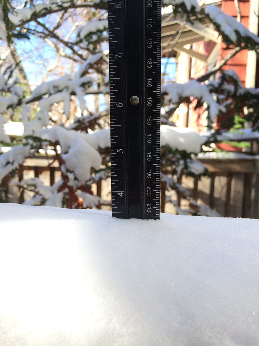 mary was already out of the house by the time i woke up, i'm assuming she went to the harvard library. with steve out of town (in denver no less on business), i spent some time in the backyard cleaning the snow off of the backyard deck. i seem to more the more responsible party when it comes to deck maintenance. besides, if i don't clear the snow from their deck, when steve finally decides to clean it, all that snow falls onto my deck and i end up having to clean it a second time. i sort of like cleaning the snow, gives me a chance to be outdoors and get some exercise, which can be hard to come by when it becomes icy all around. i also took a snowfall measurement: 3.5" this time around.