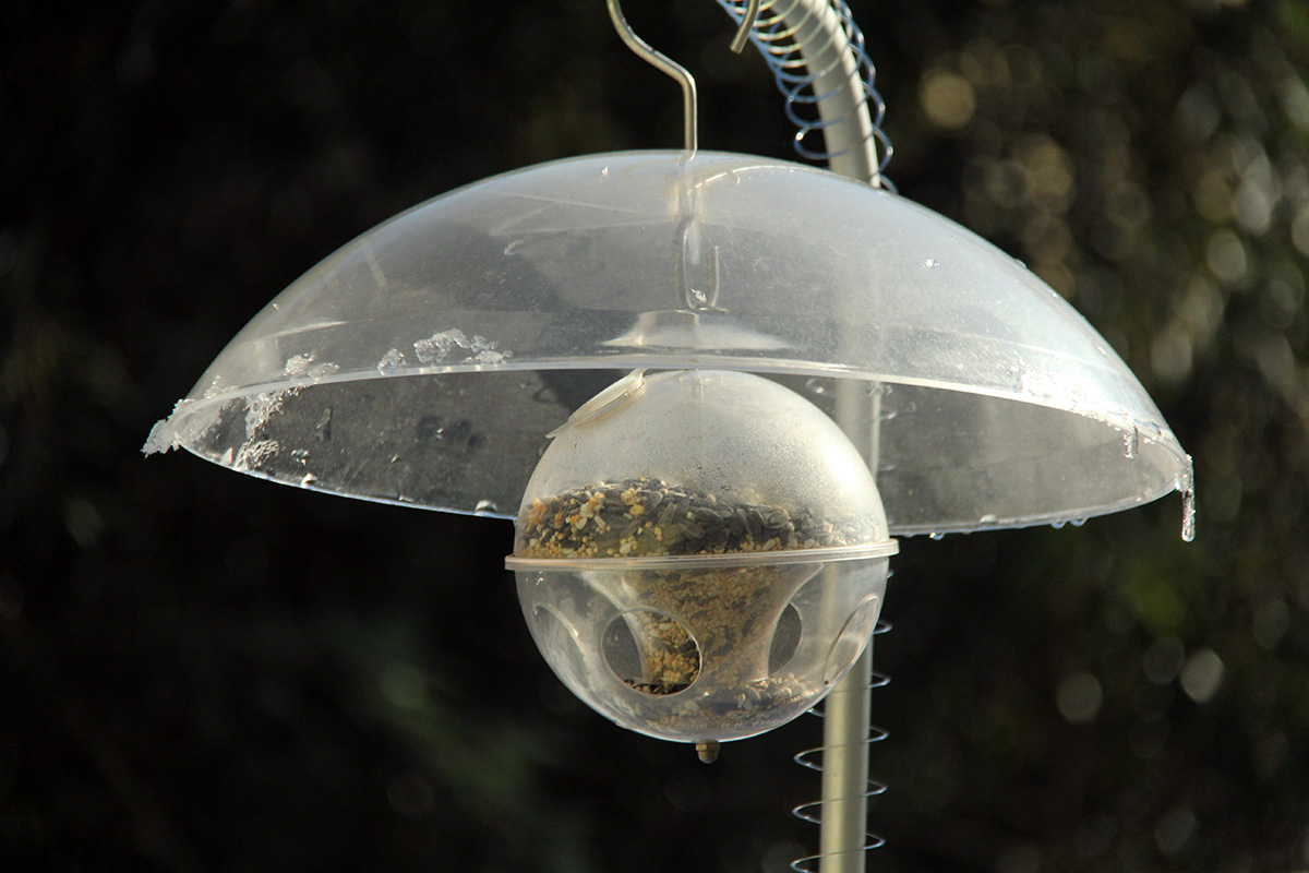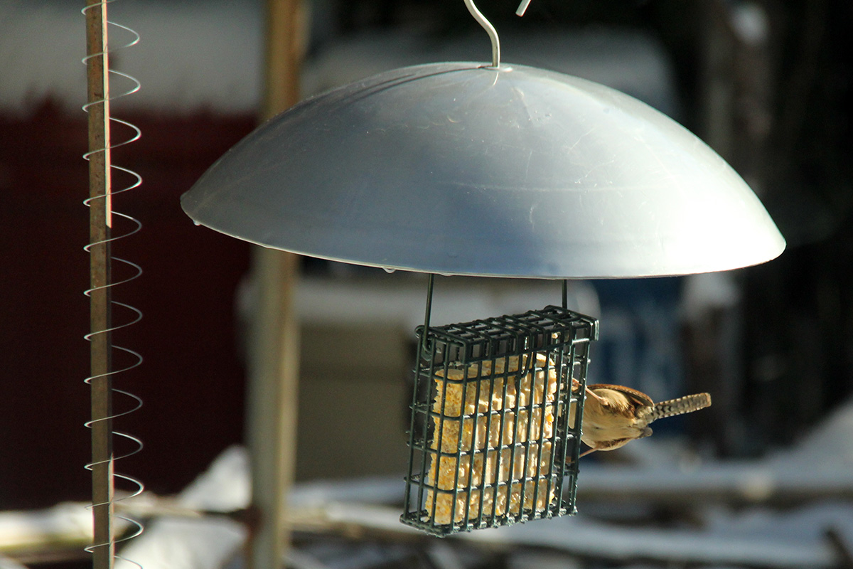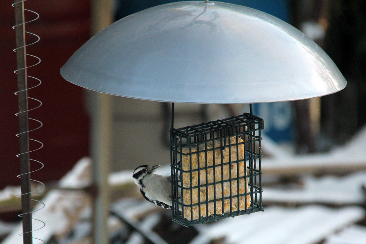 not a lot of birds came to the feeder, which was a surprise after a snowstorm. maybe they just came earlier, but from the tracks below the feeders, there doesn't seem to be a lot of activities (birds are messing feeders, which means seeds scatter onto the ground, which attract ground feeding birds and of course squirrels). the occasional downy woodpeckers, which are frequent daily visitors. a carolina wren also visited the suet feeder. i've yet to see any birds feeding from the globe feeder yet.