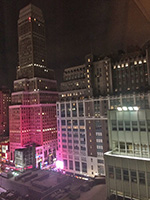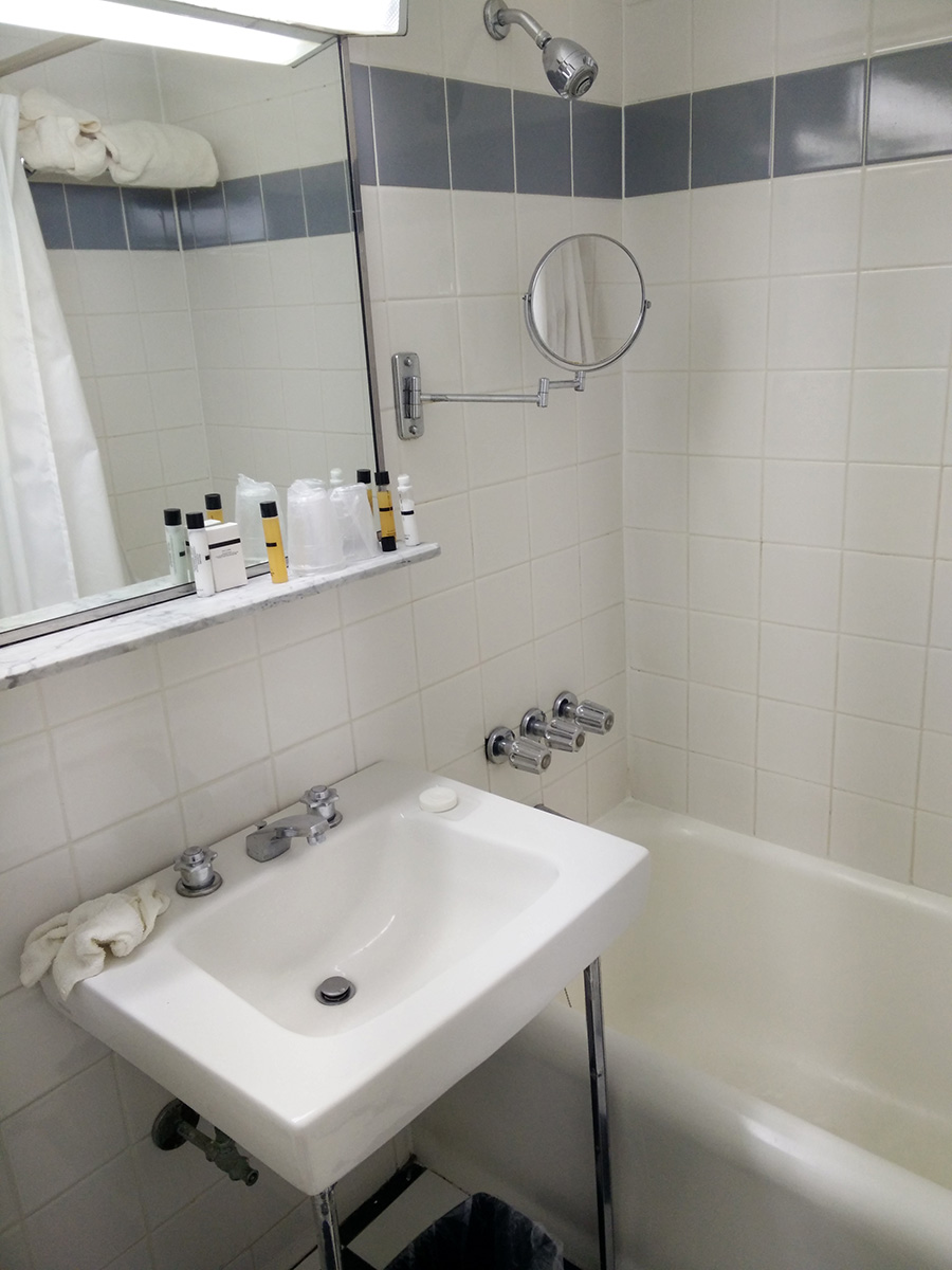 i took a shower before going to sleep. very good water pressure, even a folding shaving mirror in the bathroom. the bathtub was refitted at one point, but the plastic cover had a rip in it, revealing the porcelain underneath. the towels were adequate but a little scratchy. i read in bed until 2am, the sound of late night midtown traffic still audible 11 stories down. i slept with a breathing strip, in the hopes of preventing myself from snoring.