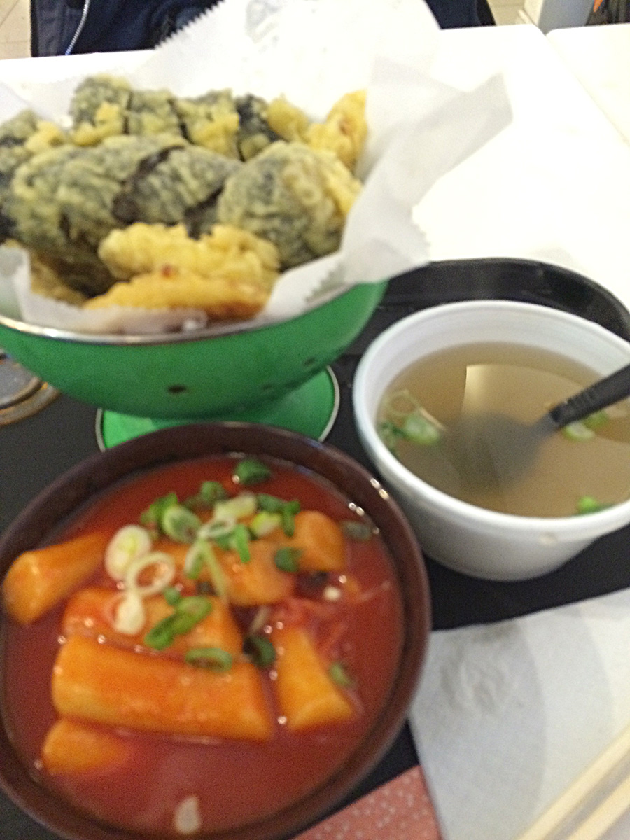 i arrived at the cacophony of the gallery32 food court. it was a lot more crowded than i've seen it before. i went to the shop that sold tempura and rice cake noodles and got an order of both. i thought it also included korean blood sausage but i made a mistake and it was just a black sausage stuffed with rice noodles. i took my order upstairs to the 3rd floor and found an empty table. i ate while trying to keep my eyes off of the noisy kpop music videos playing from overhead monitors.